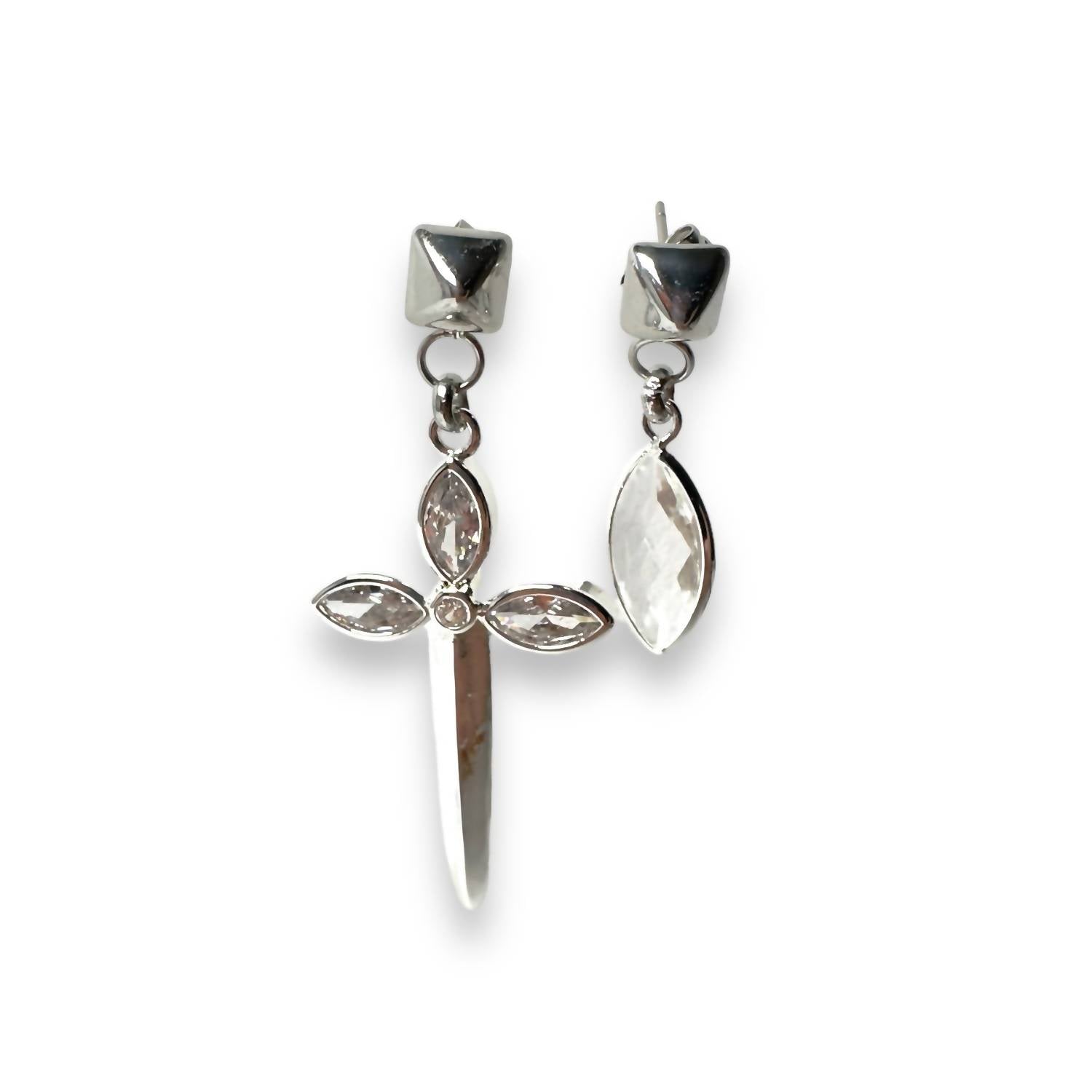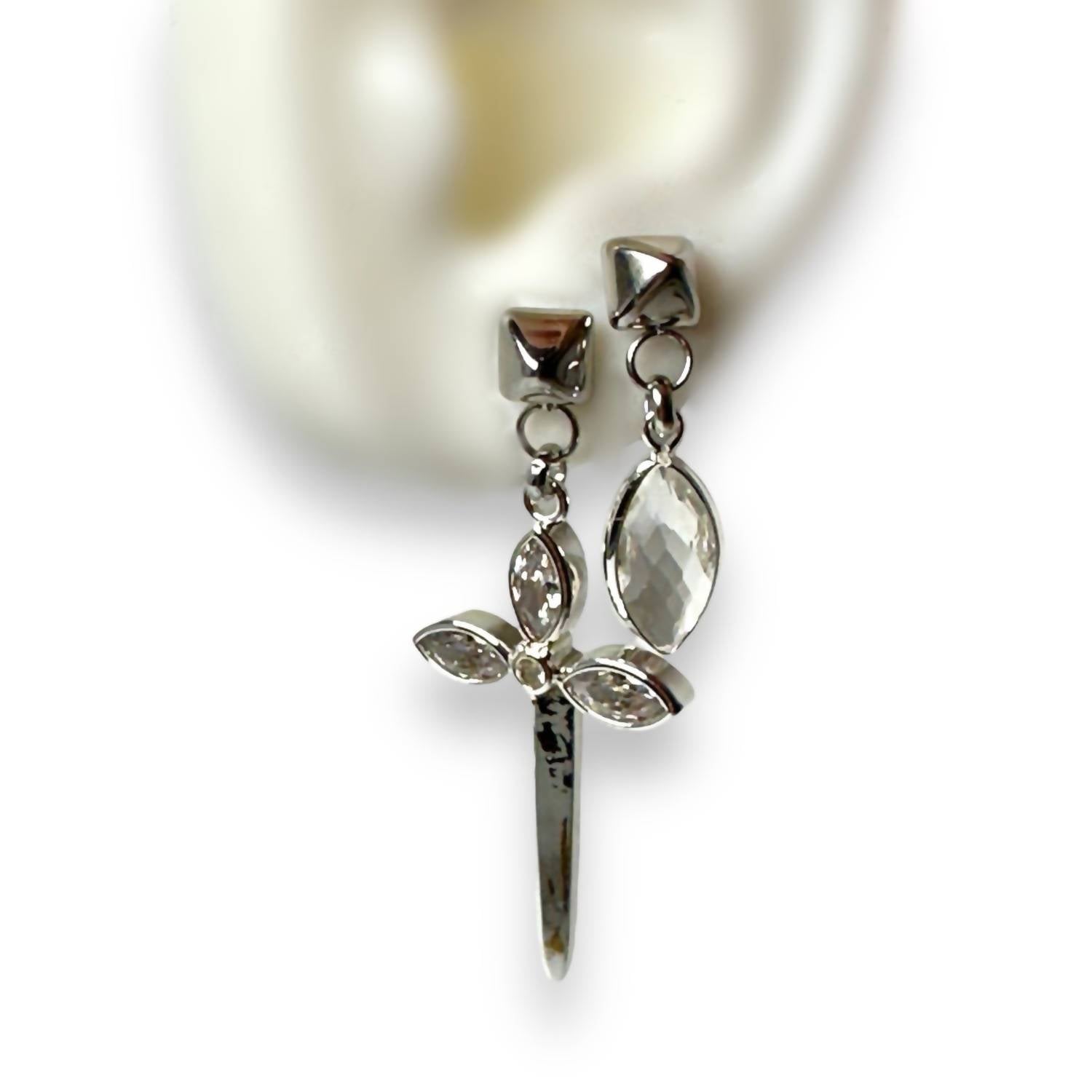 brincos atraentes para todas as ocasiões. Apresentamos os Brincos de Adaga Assimétricos Karma Femininos da Jagged Halo Jewelry, uma peça deslumbrante em aço inoxidável banhado a ouro branco. Estes brincos finos apresentam um design ousado e descombinado, com uma adaga de 5 cm de um lado e um olho de diamante de 2,5 cm do outro. São confeccionados para serem leves como uma pena, mas cheios de personalidade, personificando individualidade e charme rebelde. Cuidados: Estes brincos são à prova d'água e devem ser polidos com um pano macio; evite a exposição a produtos químicos agressivos, como perfumes e loções.