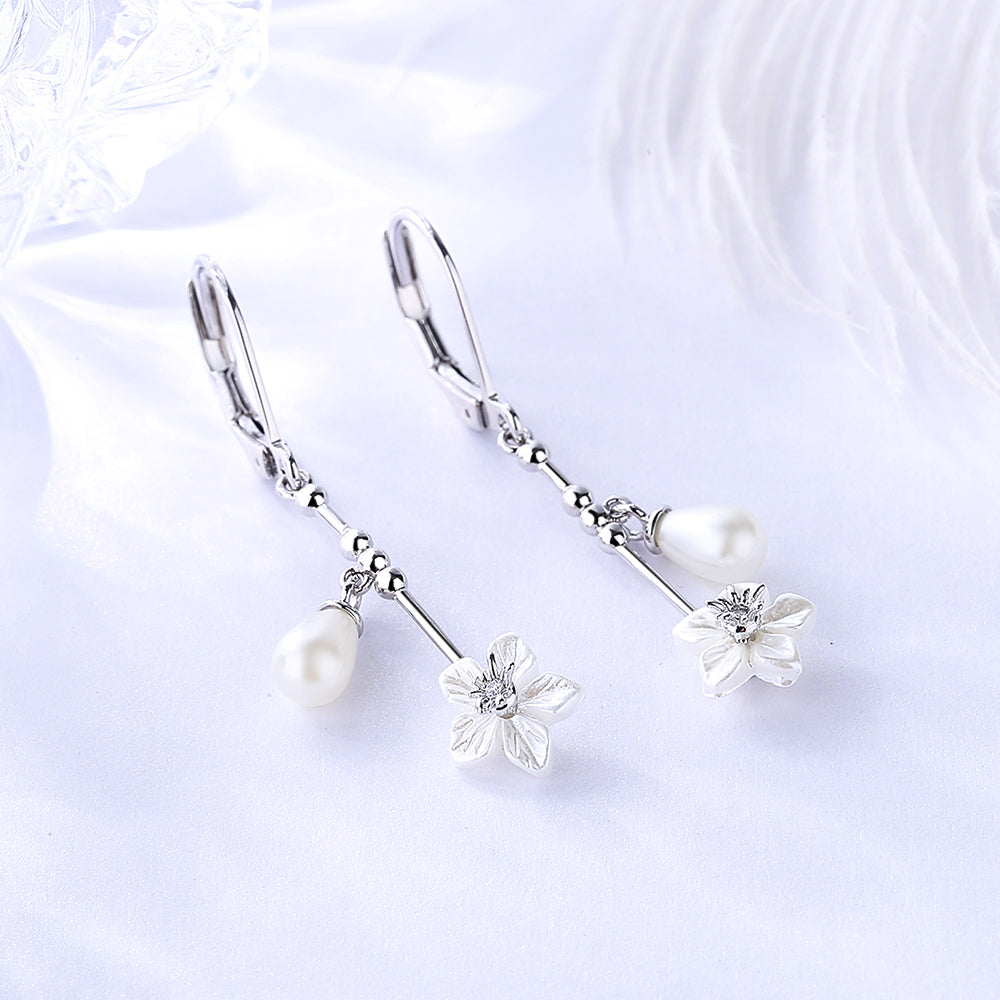 Brincos pendentes florais de pérola cultivada e prata esterlina com alavanca