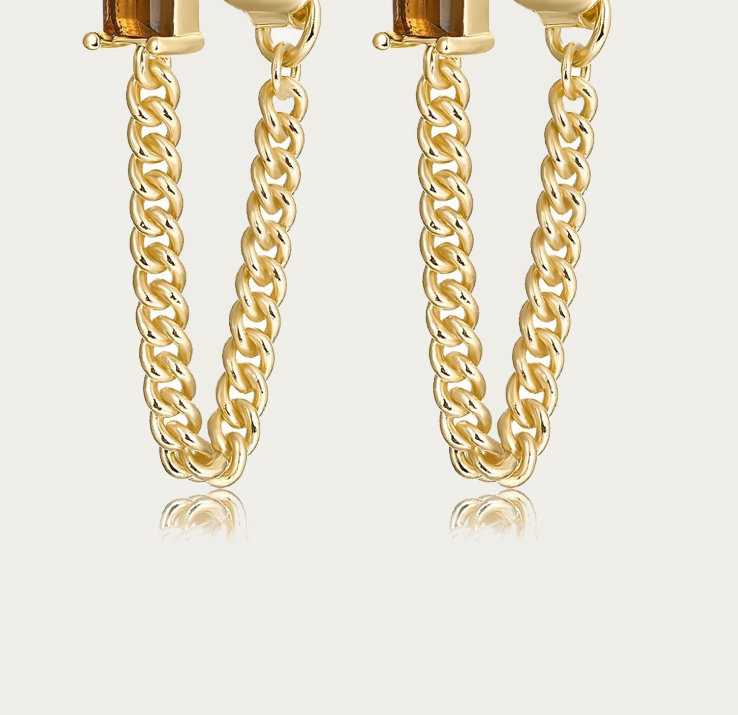 Brincos clássicos que vão te acompanhar de uma estação para outra. Apresentam pedras preciosas de corte quadrado cravejadas acima de correntes cubanas que envolvem o lóbulo da orelha. Use o seu com looks casuais ou como acessório para looks noturnos. Dimensões: 25 mm de comprimento total, 6 mm de pedra preciosa. Detalhes: Banhado a ouro 18K com quartzo fumê natural, sem níquel.