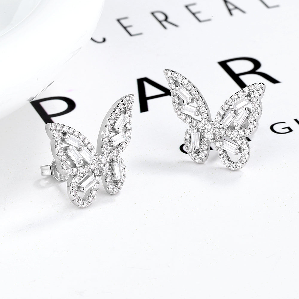 Brincos de borboleta redondos e baguete em ouro 14k e prata esterlina com cristais