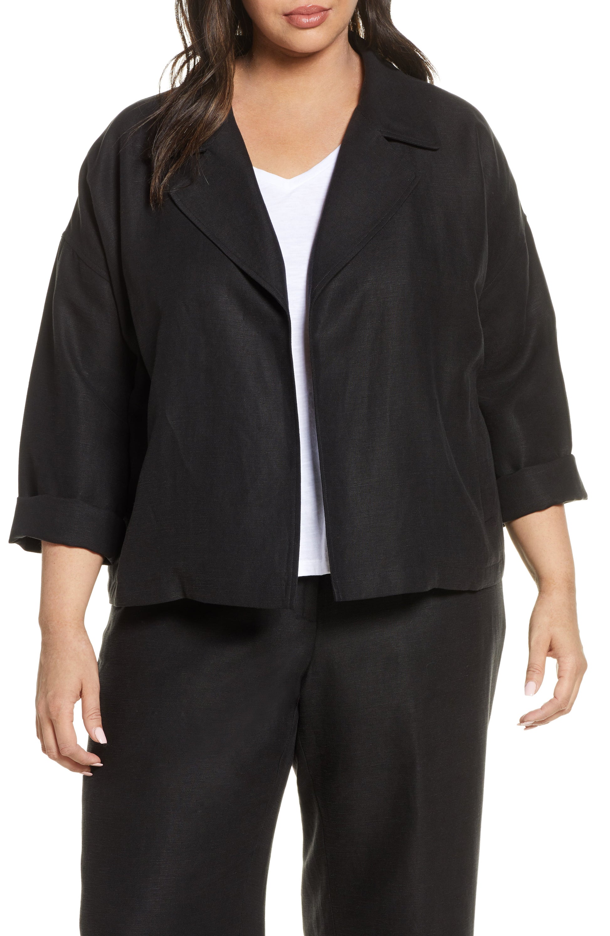 Blazer feminino Eileen Fisher preto com bolsos, manga comprida, frente aberta, para usar no trabalho, plus 1X