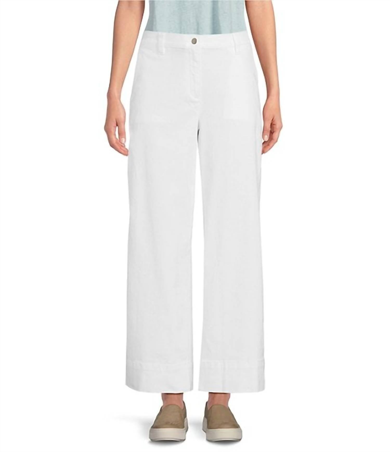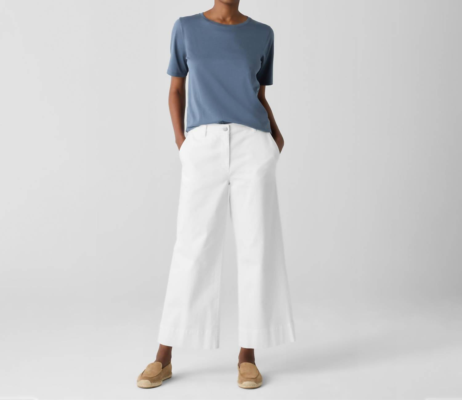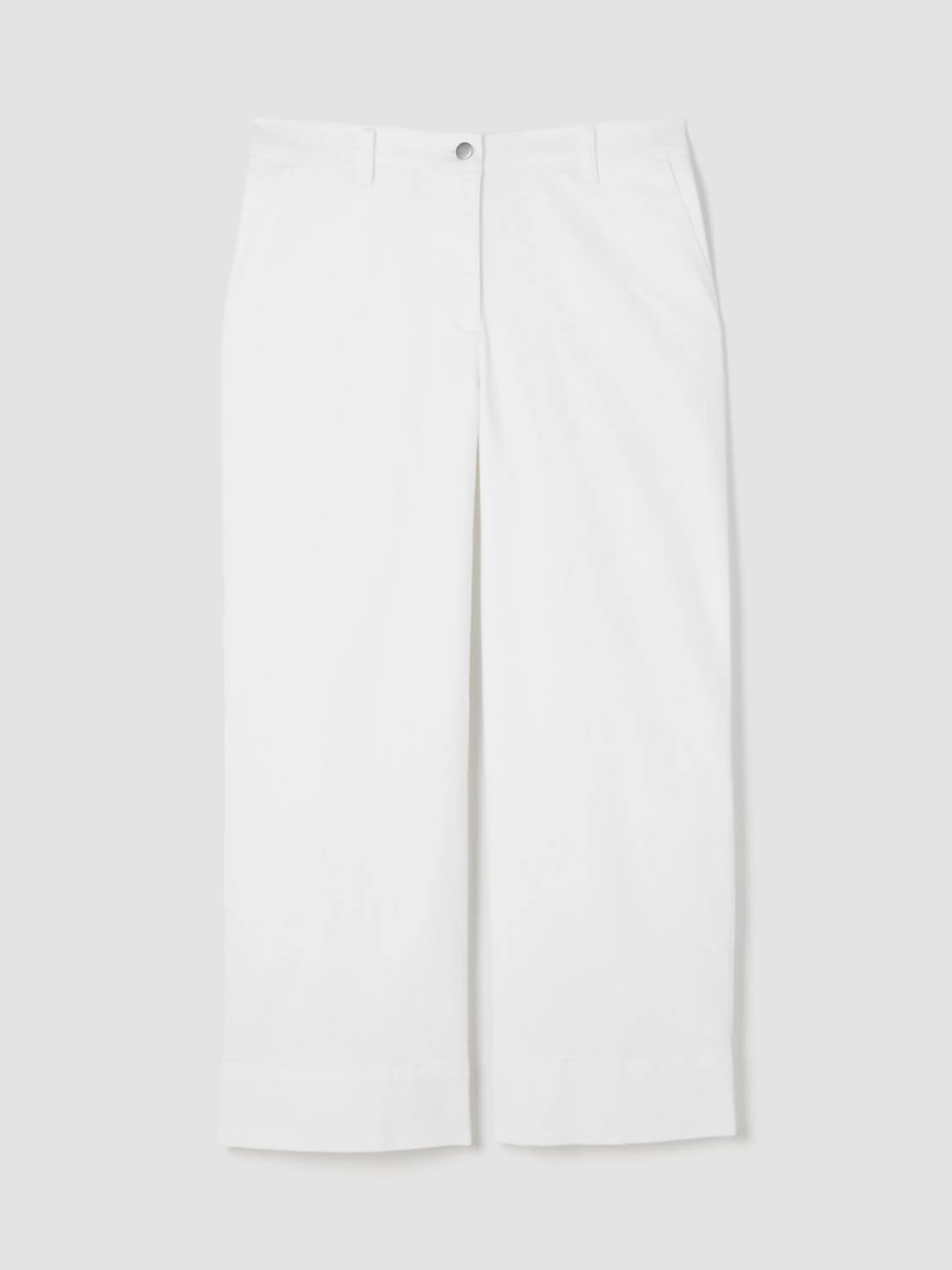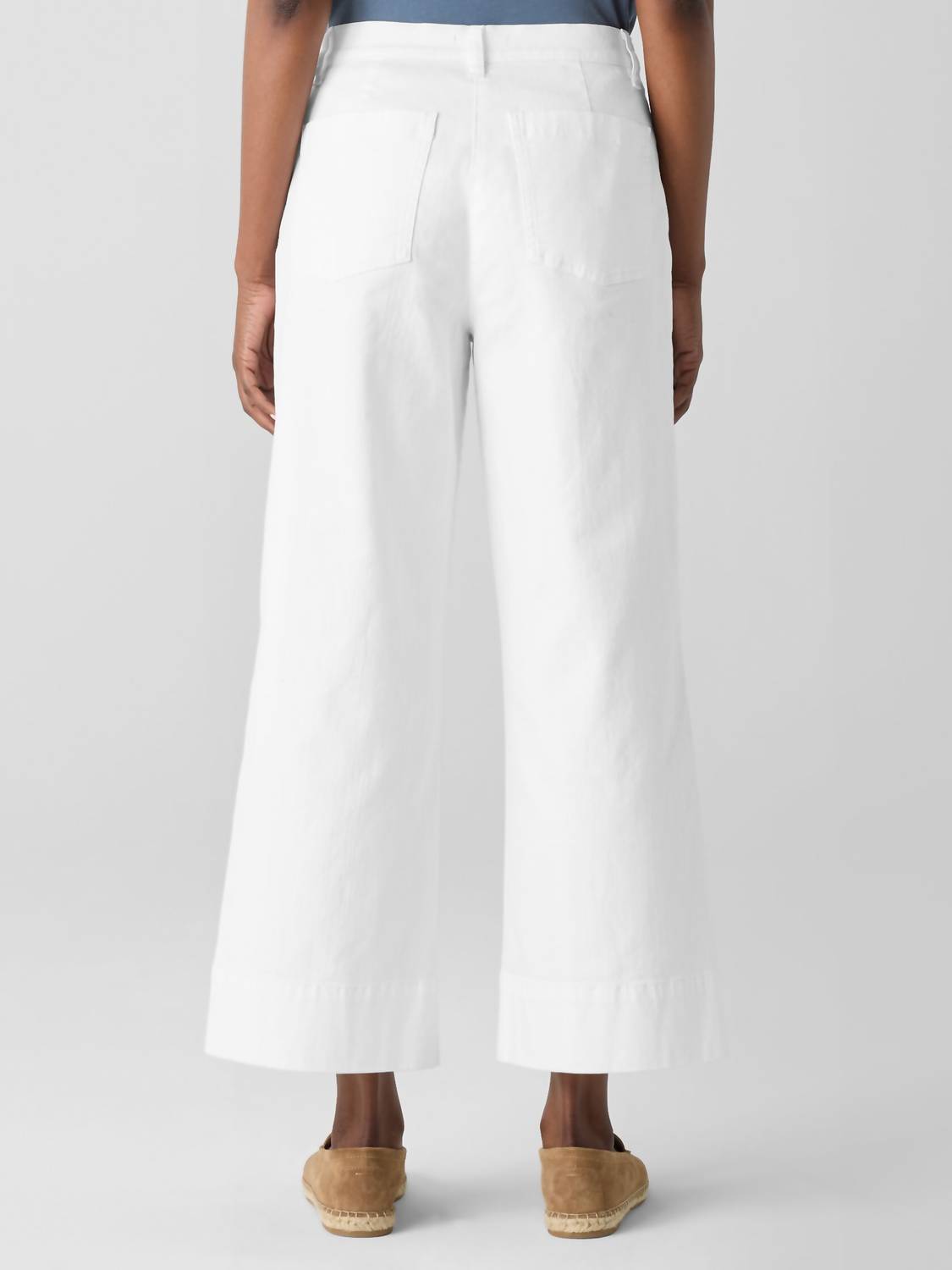 Introducing the Women's Garment Dyed Organic Cotton Denim Jeans by Eileen Fisher, designed for a minimalist style in crisp white. These wide-leg jeans feature a zip closure and offer the convenience of pockets. Perfect for a vacation wardrobe, these jeans are crafted from organic cotton denim, ensuring comfort and eco-friendliness. Embrace sustainable fashion this spring with this solid-patterned, versatile piece.