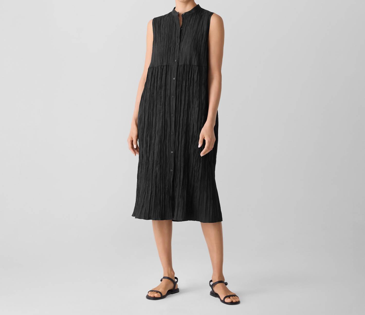 The perfect length dress does exist. Introducing the Women's Sleeveless Dress by Eileen Fisher, a chic and sophisticated choice for your summer wardrobe. This textured black shift dress features a crewneck and offers a sleek silhouette with its midi length. The dress is designed with a convenient button closure, perfect for a vacation-ready look. Embrace the monochrome trend effortlessly with this versatile piece.