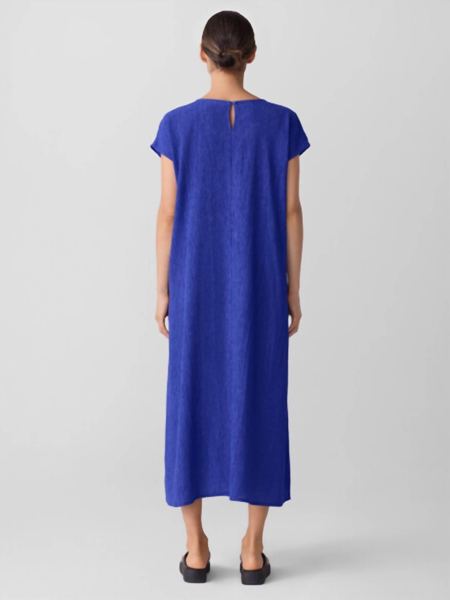Style this maxi with your favorite statement necklace and sandals for the perfect look. This round-neck dress features a fluid Woven Plissé fabric with dimensional texture for understated elegance. Designed with a silhouette that’s fitted at the shoulders and wider at the hem, it offers ease of movement. Details include cap sleeves, center front and back seams, and a keyhole with a river shell button closure at the back. Made from a blend of 70% Tencel™ Lyocell, 5% Spandex, and 25% recycled polyester, it combines comfort, stretch, and sustainability.