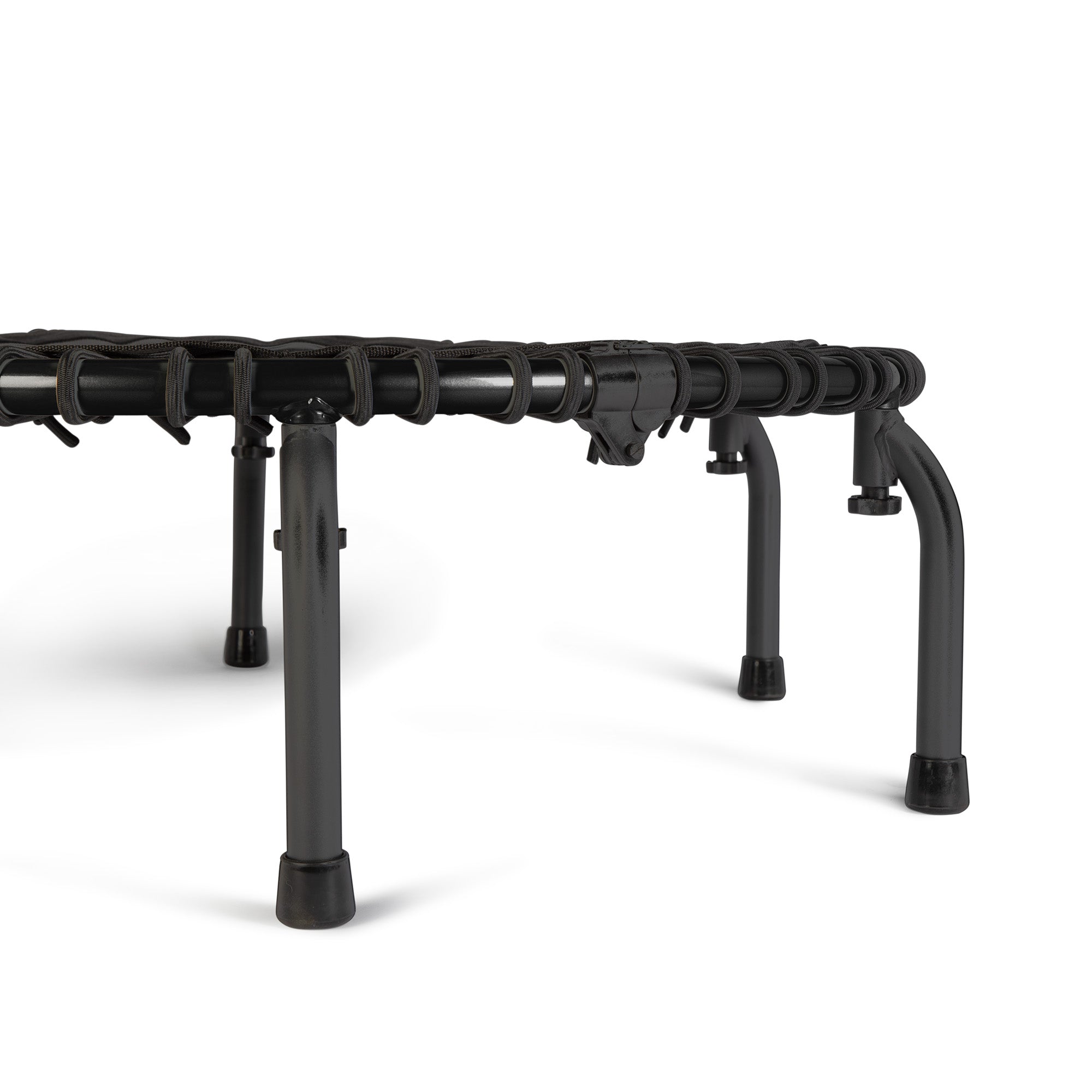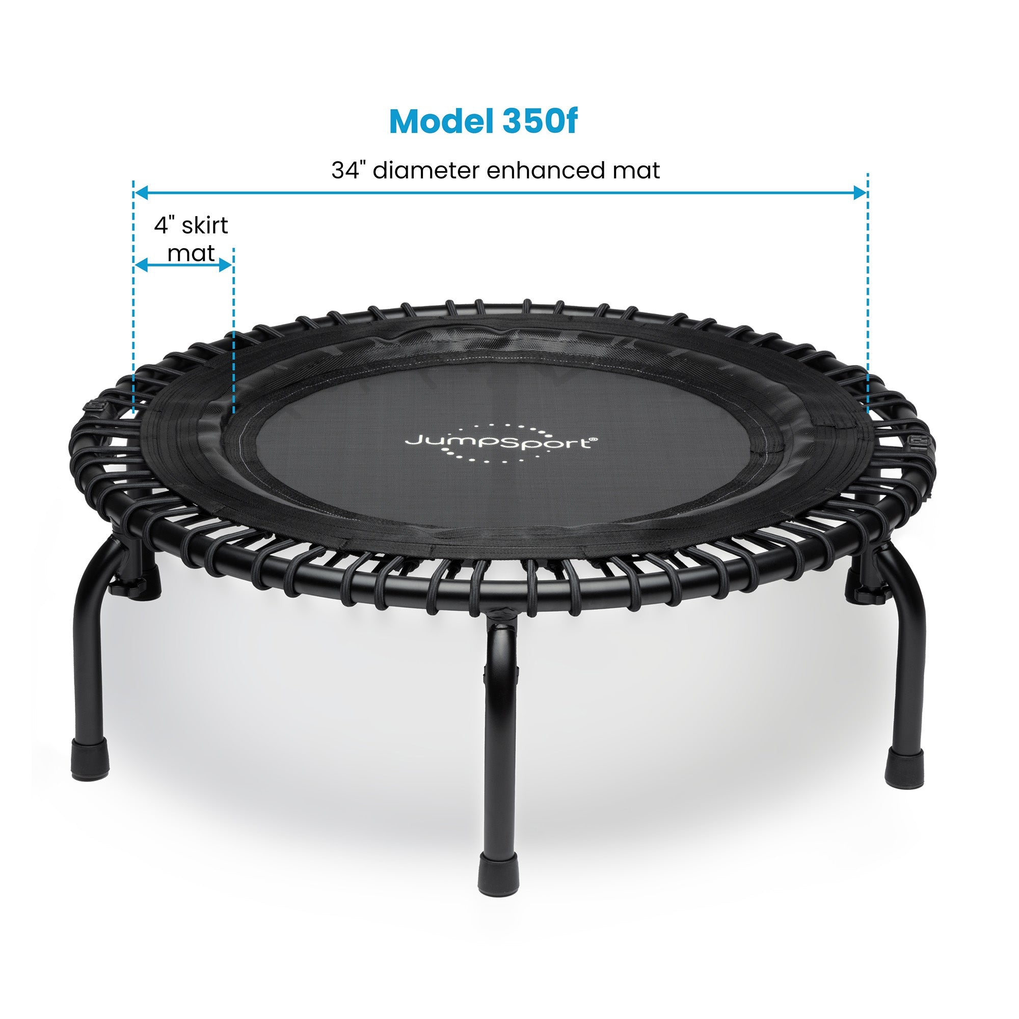 Os trampolins fitness JumpSport oferecem o salto de baixo impacto mais suave, profundo e com maior suporte do mercado. Contam com cordões elásticos EnduroLast, formulados exclusivamente para esticar até o dobro do comprimento de repouso, em comparação com os bungees padrão, que esticam apenas 1,25x o comprimento de repouso. Este design de estrutura dobrável ao meio incorpora uma dobradiça de travamento exclusiva, proporcionando uma plataforma firme e sem oscilações quando acionada. O 350f possui uma superfície de salto de 82 cm, pernas arqueadas e 3 níveis de firmeza fáceis de ajustar. A maioria dos trampolins dobráveis balança e balança ou utiliza peças pesadas de metal soldadas, o que adiciona peso e prejudica a portabilidade. A dobradiça JumpSport é leve, mas cria um trilho de estrutura superestável e rígido para saltos confiantes e seguros.