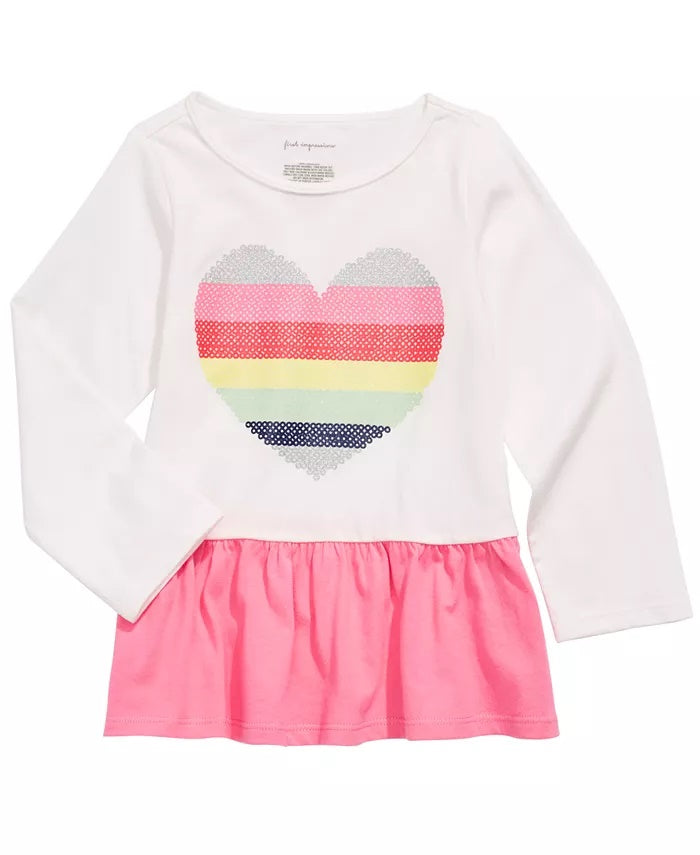 Gola redonda | Estampa de coração em arco-íris na frente; bainha peplum com blocos de cores | Todo em algodão | Lavável à máquina | Importado