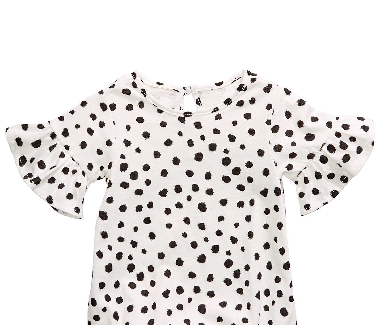 Fechos de pressão na parte inferior; abertura nas costas | Mangas sino com babados | Todo em algodão | Lavável à máquina | Importado