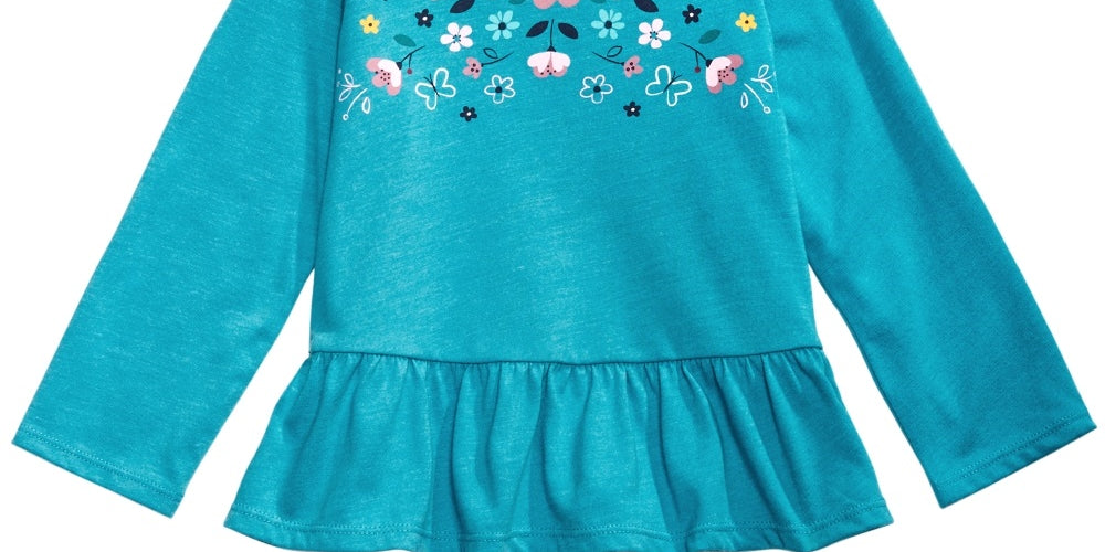 Gola redonda | Estampa gráfica na frente | Bainha peplum | 100% algodão | Lavável à máquina