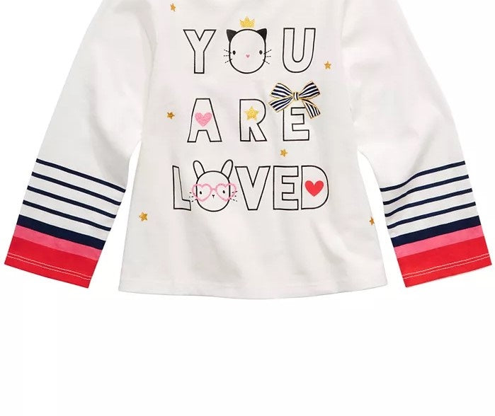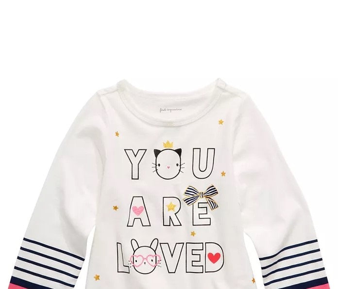 Gola redonda | Listras coloridas nas mangas; estampa gráfica na frente com aplique de laço | 100% algodão | Lavável à máquina | Importado