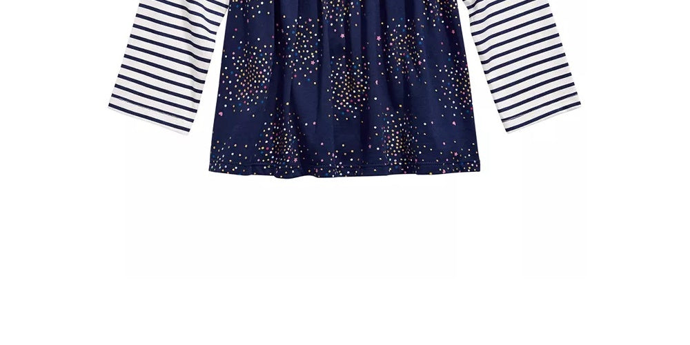 Gola redonda | Corpete e manga listrados com estampa gráfica de glitter no peito esquerdo; estampa de confete na saia | 100% algodão | Lavável à máquina | Importado