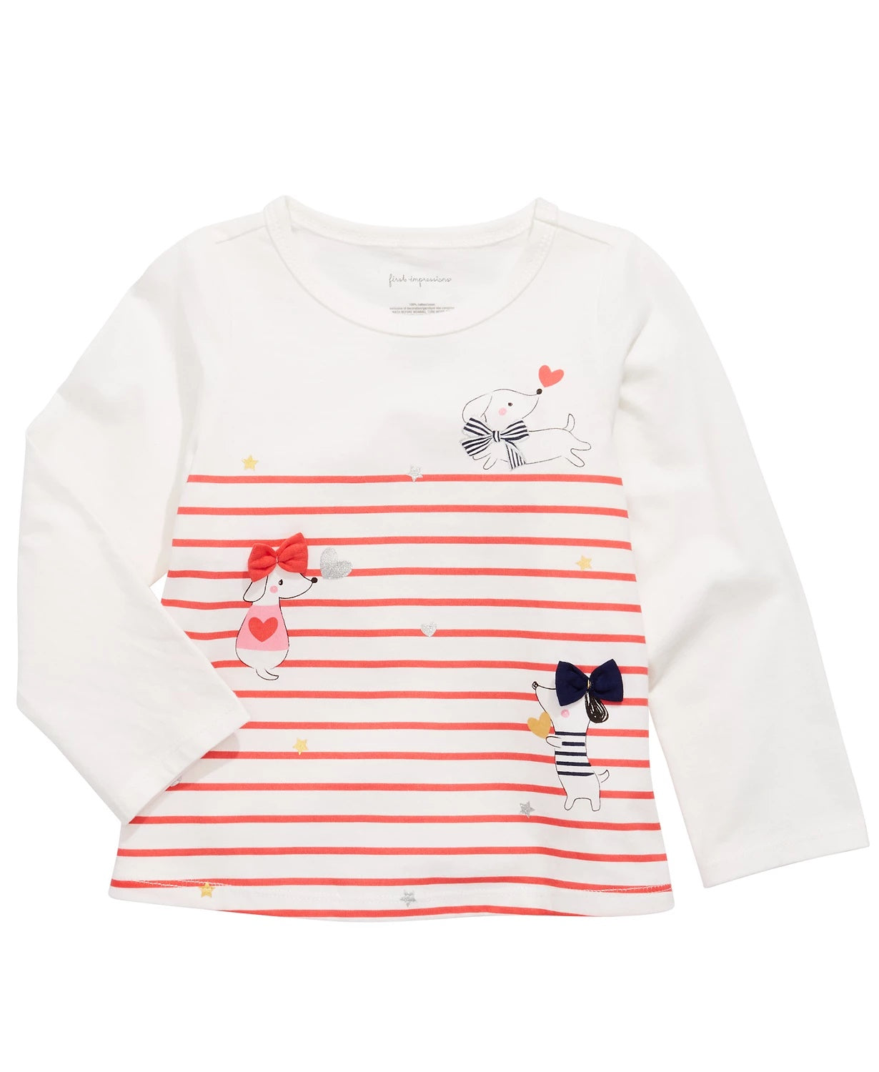 Gola redonda | Listras e estampa gráfica na frente com apliques de laço 3D | Camisa: 100% algodão; apliques de laço: poliéster | Lavável à máquina | Importado