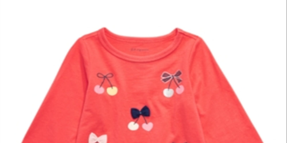 Doce e estilosa. Mantenha-a na moda com esta camiseta de algodão macia e confortável da Firs Impressions com cerejas superchiques. | Gola redonda | Estampa de cereja na frente | | Todo em algodão | Lavável à máquina | Importado