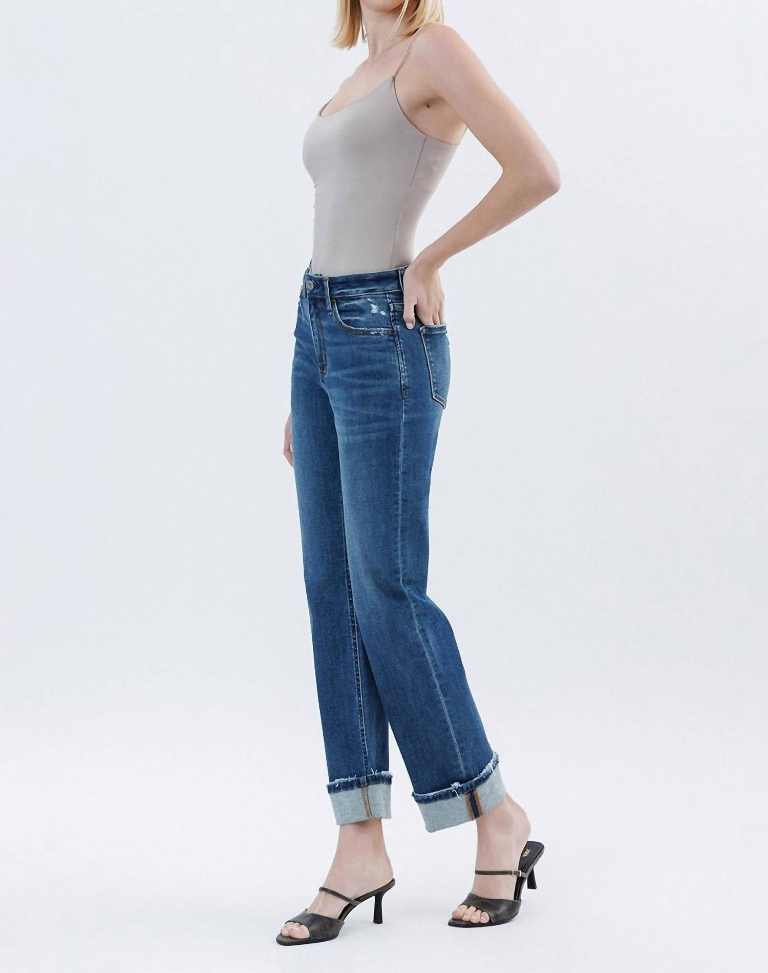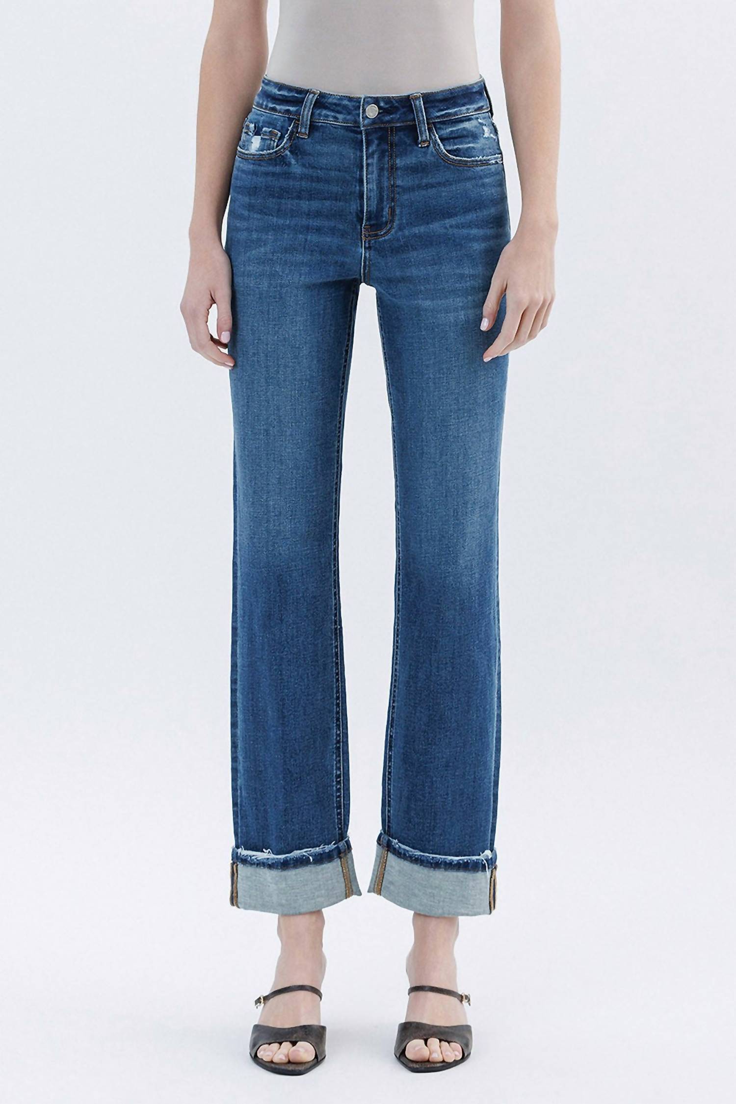 This classic straight leg jean has a perfect fit and goes with just about everything. Introducing the Blythe High Rise Cuffed Straight Leg Denim Jeans by FLYING MONKEY, designed for effortless style and comfort. These jeans feature a relaxed fit with a high-rise waist and a straight leg, perfect for a timeless, 90s-inspired look. Crafted from a cotton blend including 92% cotton, 6% T400, and 2% Lycra, they provide a solid structure with a hint of stretch. Finish: Medium wash. Closure: Button closure. Care instructions are simple: Machine wash and tumble dry.