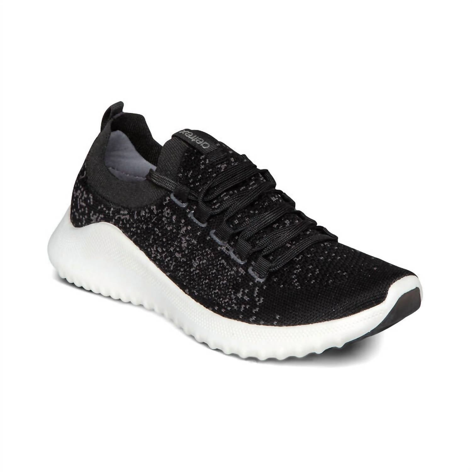 When fashion meets function. The Women's Carly Shoes by Aetrex in a classic black finish are perfect for stylish summer vacations. Designed with a round toe and flat heel, these low (1 1/4"-2") athletic shoes offer both comfort and a sleek, monochrome look. Ideal for women seeking functional fashion for their seasonal getaways. Embrace the effortless elegance and support these shoes provide, making each step a breeze.