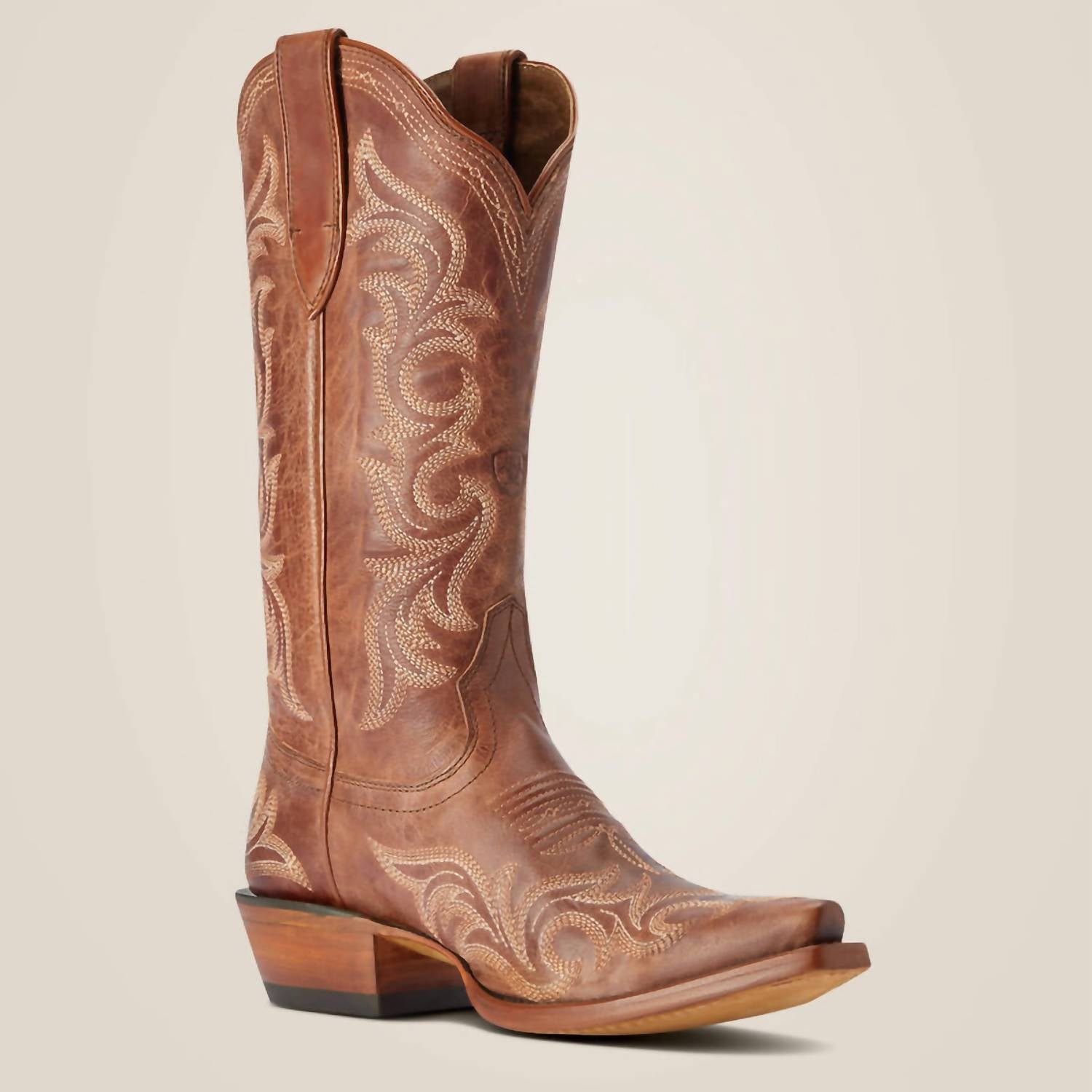 A stylish boot with a comfortable fit and the perfect amount of height. These classic boots are the perfect addition to any outfit and can be worn season after season. Introducing the Women's Hazen Western Boot by ARIAT, perfect for the Fall season with a whiskey barrel finish. This medium-width boot features a comfortable 12" shaft height and a 1.5" block heel, embodying a nod to traditional Western style with an elegant X toe and five-row stitch pattern. Crafted from full-grain leather and vegetable-tanned leather sole, the boot includes ATS® technology for ergonomic support, ideal for music festivals or any casual occasion. The boot is resolable with a Goodyear leather welt construction, ensuring durability and long-lasting wear.