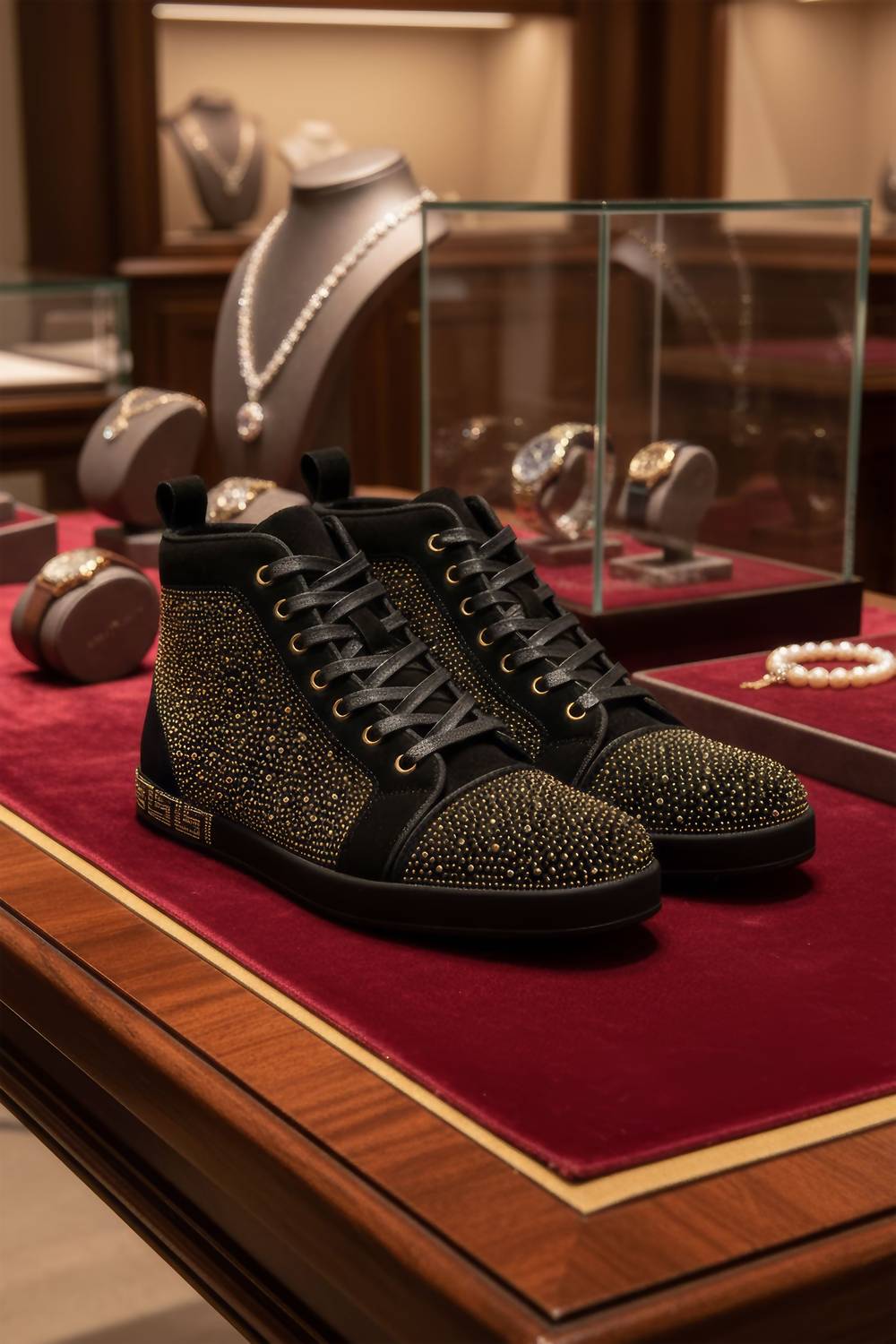 Elevate your style with the Men's Show Stopper High Top Sneakers by BARABAS, featuring a luxurious Greek key pattern and dazzling rhinestone diamond detailing. These multi-colored high-top sneakers offer a round toe and a comfortable flat heel, perfect for any occasion, even camping. Made with a leather lining and a black man-made sole, they ensure durability and comfort. Lace-up. Spot clean to maintain their pristine appearance.