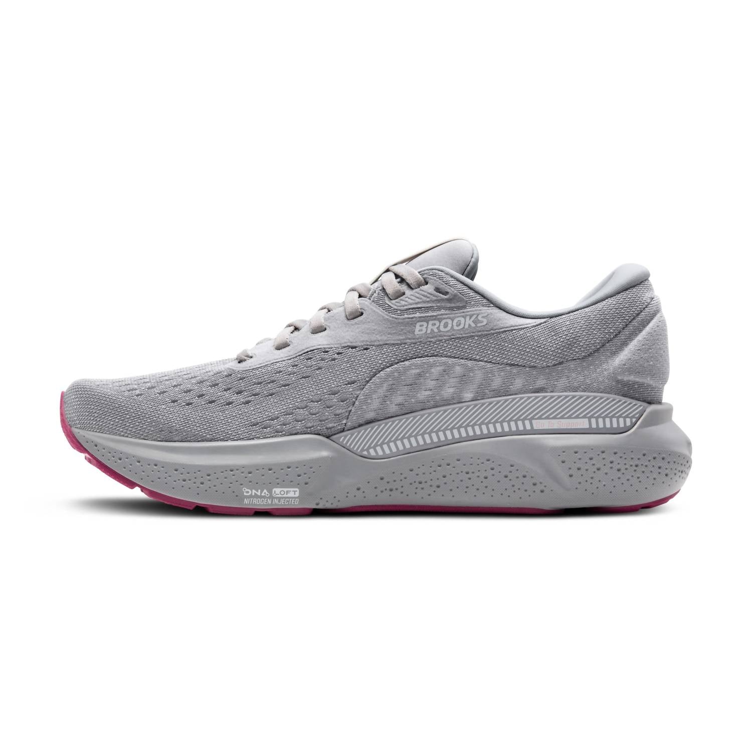 Introducing the Brooks Women's Adrenaline GTS 24 Running Shoes, crafted from recycled materials with a stylish Alloy/White/Zephyr mesh upper. Designed for road running, these athletic shoes weigh 8.8 oz and boast a 12mm midsole drop for optimal performance. They feature nitrogen-infused cushioning for lightweight softness and a supportive GuideRails® system to reduce excess motion. With 62.7% recycled materials in the upper, this footwear embodies the athleisure trend while emphasizing sustainability, perfect for your spring fitness wardrobe.