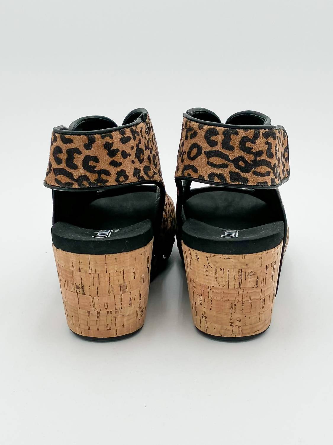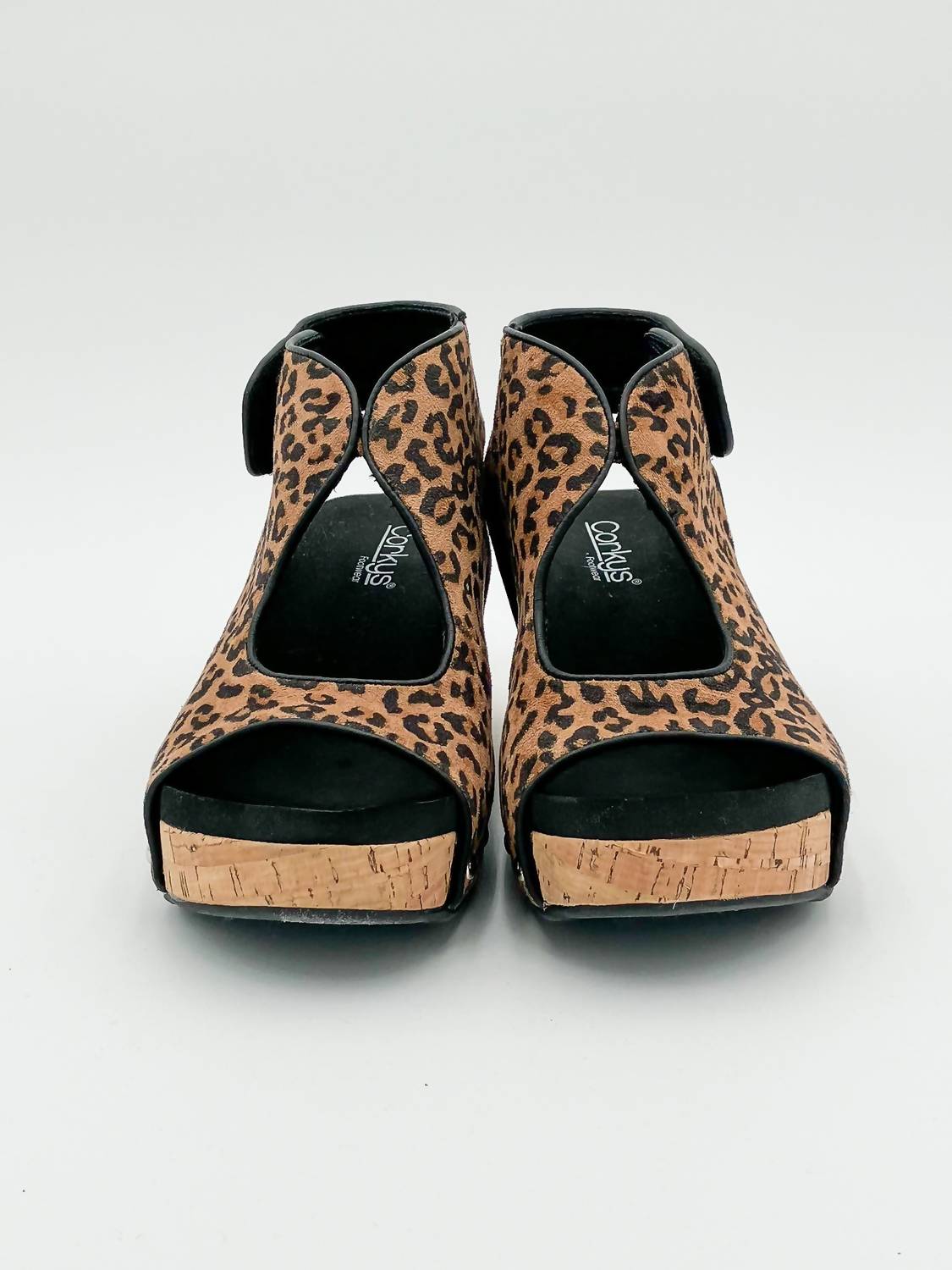 Elevate your footwear game with these adorable wedges. Step into style with the Women's Frisky Faux Suede Leopard Wedges by Corkys Footwear, a chic addition to your fall collection. These wedges, designed with a playful caramel faux suede, boast an open toe and a comfortable 2" wedge heel, ideal for travel and Thanksgiving gatherings. Pair these Boho Chic essentials to elevate your look for any occasion this fall.