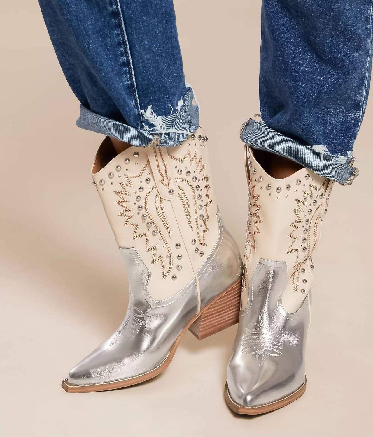 Step out in confidence and showcase your impeccable taste with these fashionable and versatile boots. Their classic style will have you reaching for these boots season after season. Step into style with the Women's Moonlight Boot by Dolce Vita, designed to make a statement. Crafted from metallic faux leather in a striking silver and cream colorway, these boots feature intricate embroidery and studded accents. With a mid heel height of 2.5 inches and a 9-inch shaft, these pointed-toe booties offer both comfort and elegance with a cushioned footbed and block heel design. Perfect for dinner parties and summer events, elevate your wardrobe effortlessly with this western-inspired staple.