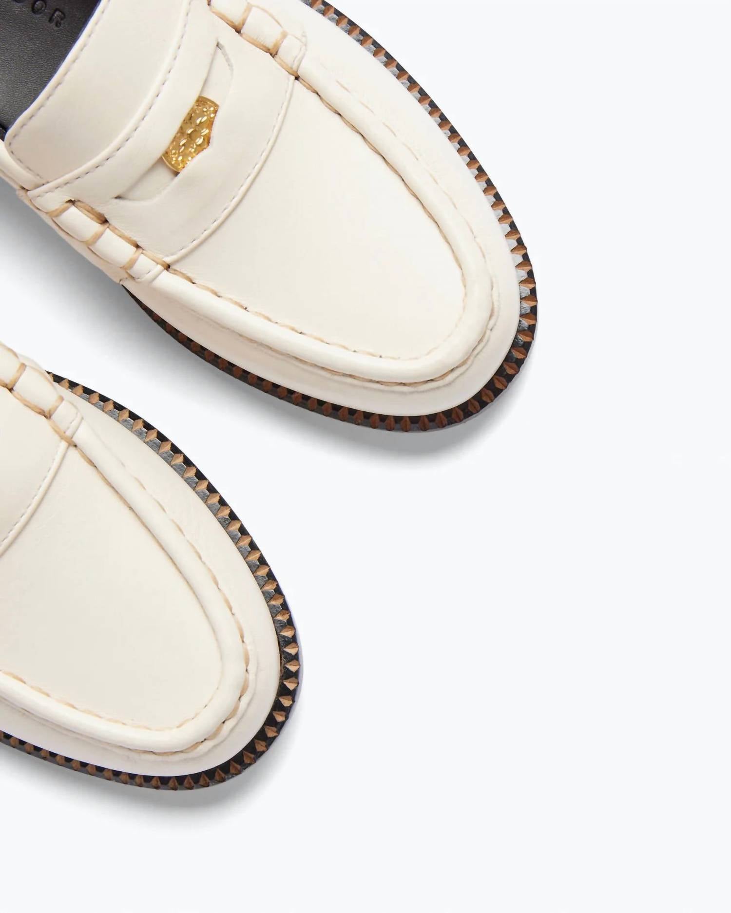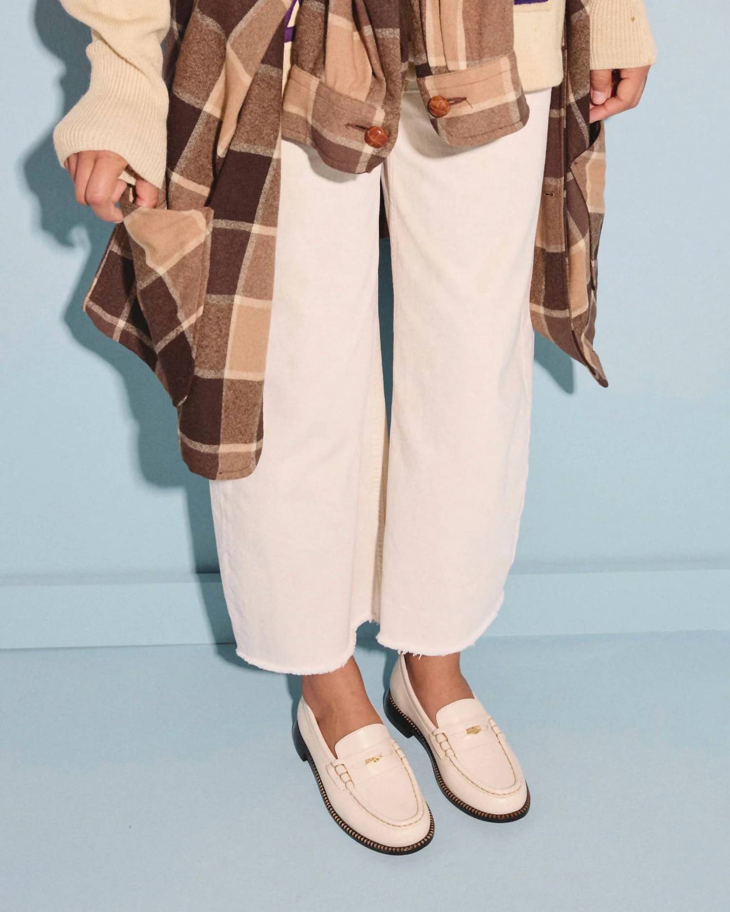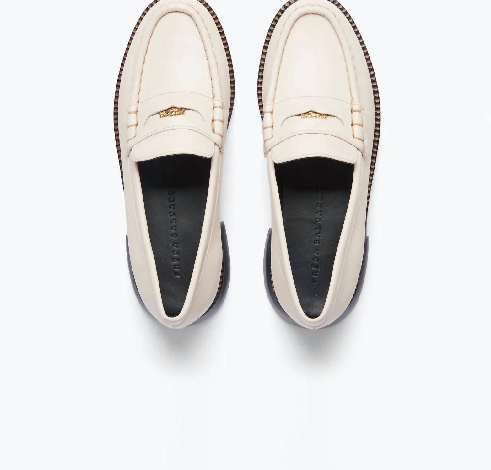 A classic loafer that is both comfortable and polished. Introducing the Women's Elba Penny Loafer by FREDA SALVADOR, a chic reinterpretation of a classic in Bone Calf Khaki. Handcrafted from 100% Italian leather, these loafers feature a round toe, medium width, and a distinctive gold-plated removable coin in the penny keeper. The 0.75" flared leather stacked heel and sueded sole complete the design, perfect for occasions from holiday parties to workwear trends. These timeless loafers not only make a fashion statement but are also sustainably crafted by a tannery rated Leather Working Group Silver.