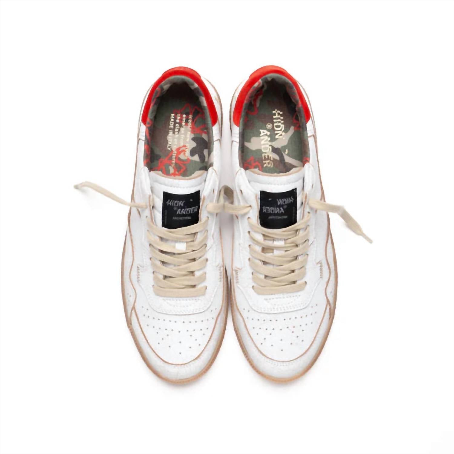 Cute, functional, and comfortable. These sneakers check all the boxes. Introducing the Women's Mega T Sneaker by Hidnander, an Italian-crafted shoe inspired by the elegance of tennis. This legend-worthy sneaker features an upper made from a luxurious blend of suede and leather in a sleek white and red design. The retro rubber outsole boasts a low profile, perfect for those who appreciate minimalist style with a touch of boldness. Ideal for game day, these sneakers embody Hidn-ander's sustainable design approach.