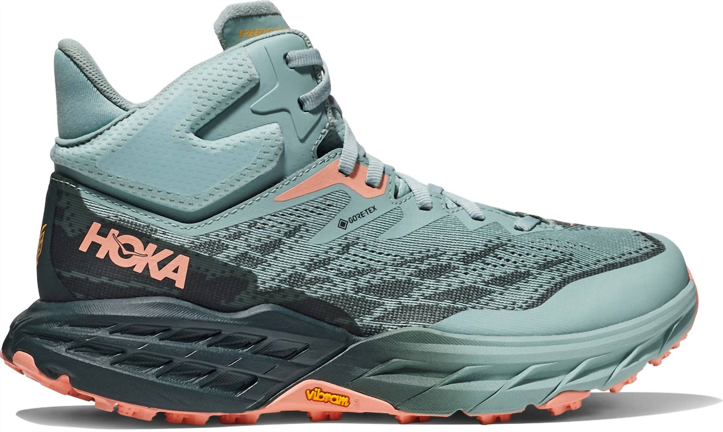 When fashion meets function. Introducing the Women's Speedgoat 5 Mid GTX Trail Running Shoes by Hoka, a powerhouse designed for challenging trails in Agave/Spruce. With a waterproof GORE-TEX membrane and a 44% recycled polyester double-layer jacquard engineered mesh, these mid-rise shoes offer robust protection against adverse weather. They feature a lay-flat gusseted tongue, rubber toe cap, and Vibram® Megagrip with Traction Lug for superior stability on loose terrain. Crafted for ultimate comfort and performance with a molded EVA sockliner and compression-molded EVA midsole, this pair is ideal for summer trail running and hiking adventures.