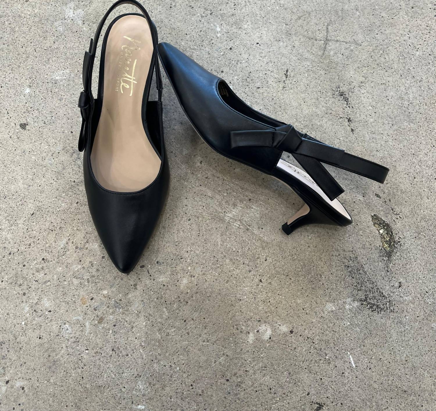 Flowy dresses, cropped pants, and even jumpsuits... this sandal works with them all! Add a touch of playful elegance with the MR-Nanette Lepore Rhona Pump in Black. This pointed-toe slingback features a charming asymmetrical bow detail at the back strap and a sleek slip-on design. Set on a graceful 2.25" kitten heel, it blends sophistication with comfort. Crafted with leather and polyurethane faux leather uppers and sole, it’s a versatile choice for both polished daytime looks and evening flair.