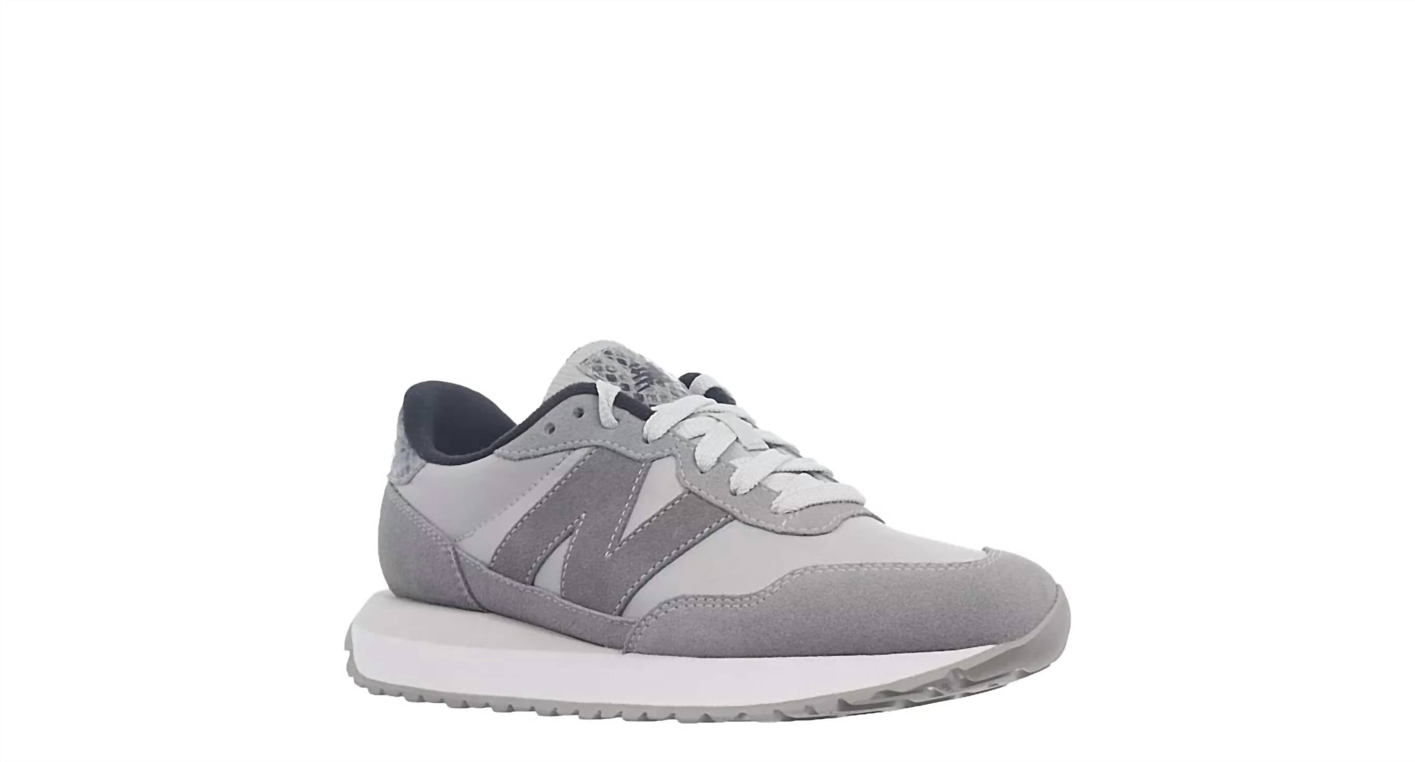 When fashion and function come together seamlessly. Introducing the New Balance Women's WS237AGG Sneaker, a perfect blend of retro style and modern performance. This grey sneaker features a round toe and a suede/synthetic upper with a lace-up closure. Designed for fitness enthusiasts, the exposed foam tongue and EVA midsole ensure comfort, while the herringbone outsole provides stability. Embrace the athleisure trend with this versatile flat-heeled sneaker, ideal for spring workouts.