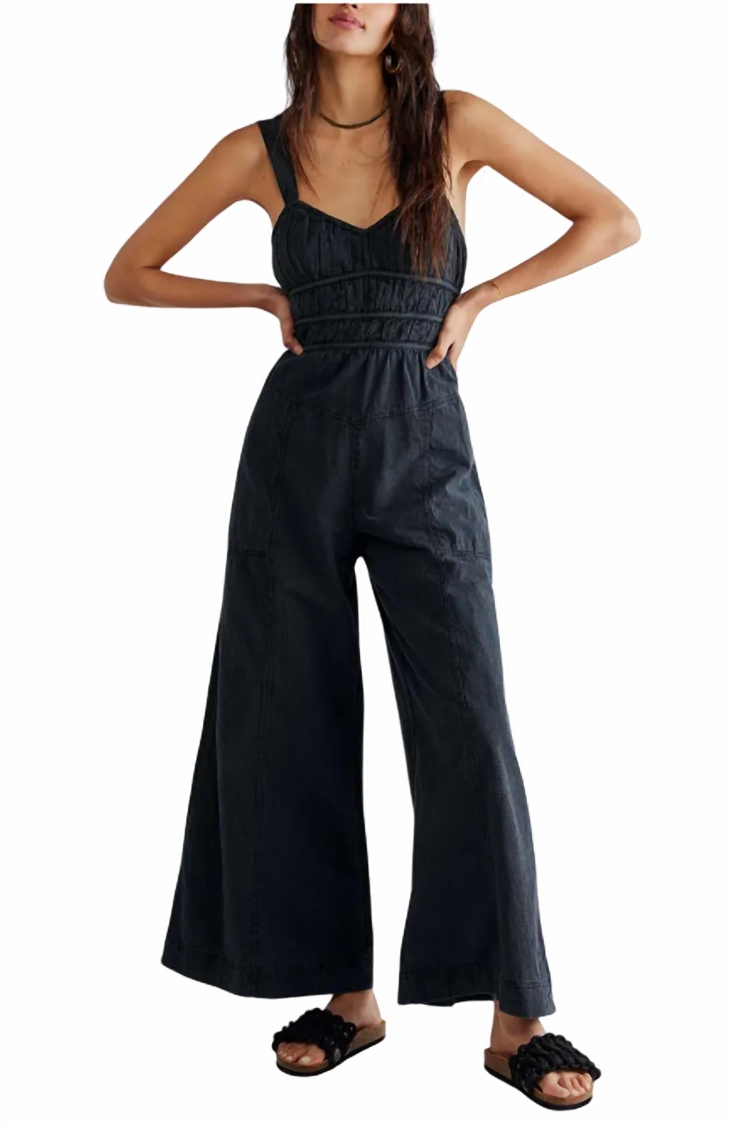 Um corpete franzido com amarração nas costas cobre este macacão de algodão leve e arejado, com pernas largas. 117 cm de comprimento central na frente; 71 cm de costura interna; 81 cm de abertura nas pernas (tamanho médio). Decote em V. Sem mangas. Parcialmente forrado. Lavagem à máquina com água fria. 100% algodão.