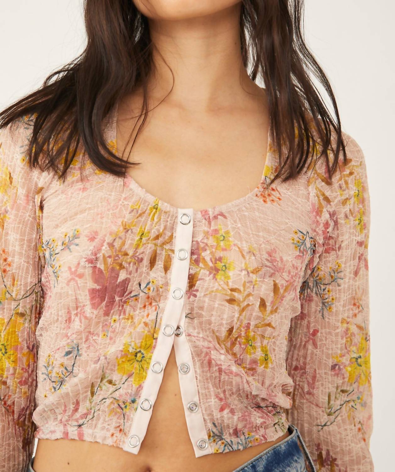 Tão adorável em um design de renda floral, este top atemporal é apresentado em uma silhueta curta de manga longa com fecho de botão frontal e fabricação texturizada para maior dimensão.