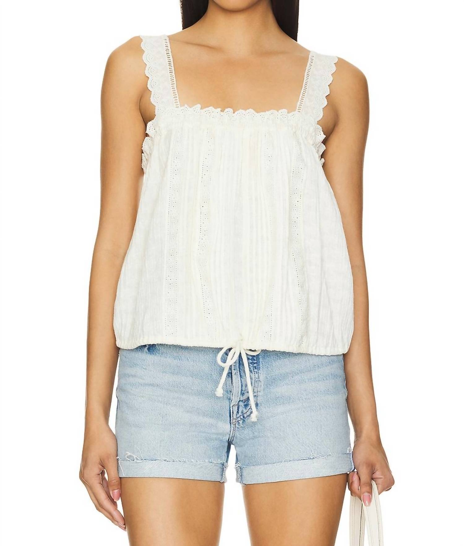Este top apresenta decote quadrado com acabamento franzido e babados, além de alças largas fixas com acabamento franzido. Possui ilhós e franzidos em toda a peça, barra com cordão e textura leve. Confeccionado em 85% algodão e 15% linho. Lavável à máquina. Fabricado na Índia.
