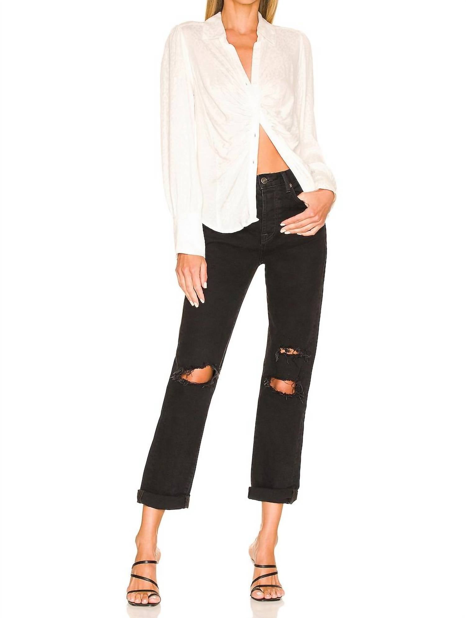 Experimente o chique casual com a calça jeans Bren Boyfriend da Free People na cor Black Magic. Confeccionada em 66% algodão, 33% liocel e 1% elastano, esta calça jeans oferece elasticidade confortável e caimento alto. Fabricada na Turquia, ela apresenta fecho de botão, leve franzido, detalhes destroyed e um estilo prático com 5 bolsos. Fácil de cuidar, pode ser lavada na máquina e seca na secadora; as dimensões incluem 73 cm de costura interna, 25 cm de altura, 37 cm de abertura no joelho e 30 cm de abertura na perna.