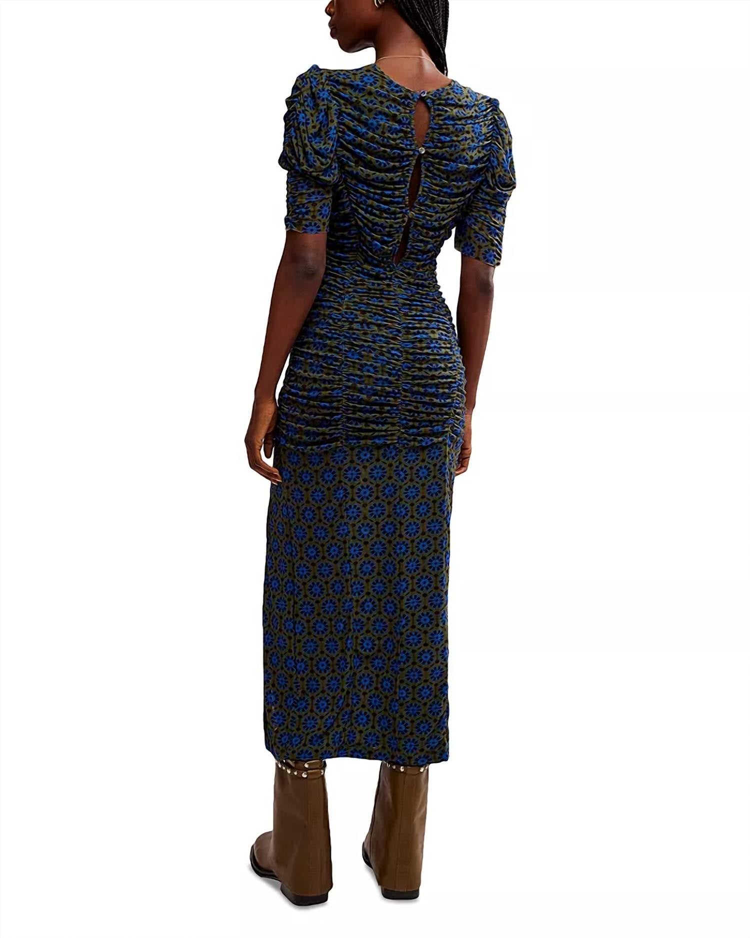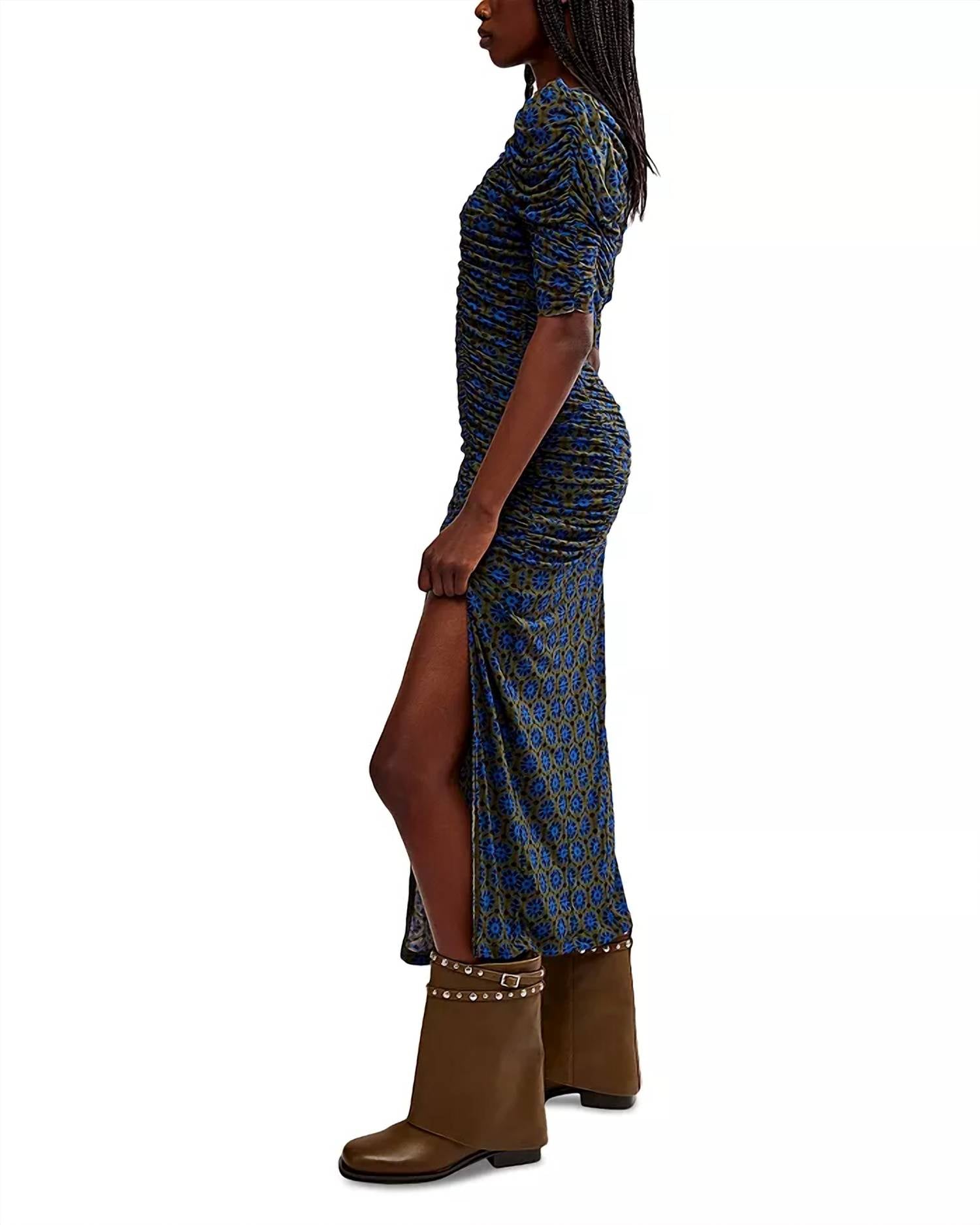 Ajuste: Silhueta ajustada e franzidaCaracterísticas: fecho de botões em camadas nas costas, fenda lateral exagerada, decote redondo, franzido exagerado