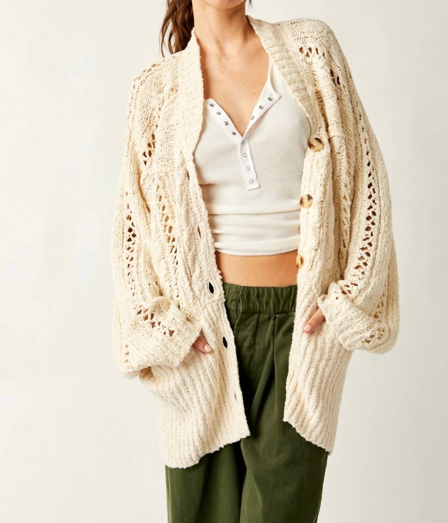 Deixe-se envolver pelo charme natural. A fusão perfeita de romance e rock 'n' roll. A beleza em tom creme captura a essência despreocupada do estilo boêmio com suas costuras abertas ecléticas e uma silhueta oversized e aconchegante. Confeccionada em uma mistura luxuosa de 85% algodão e 15% acrílico. Garante o equilíbrio perfeito entre maciez e aquecimento. Fechamento frontal por botões. Punhos e bainha canelados. Oferece um ajuste confortável. Mangas compridas e bolsos funcionais aumentam sua praticidade. Pode ser lavada à mão para manter sua elegância duradoura.