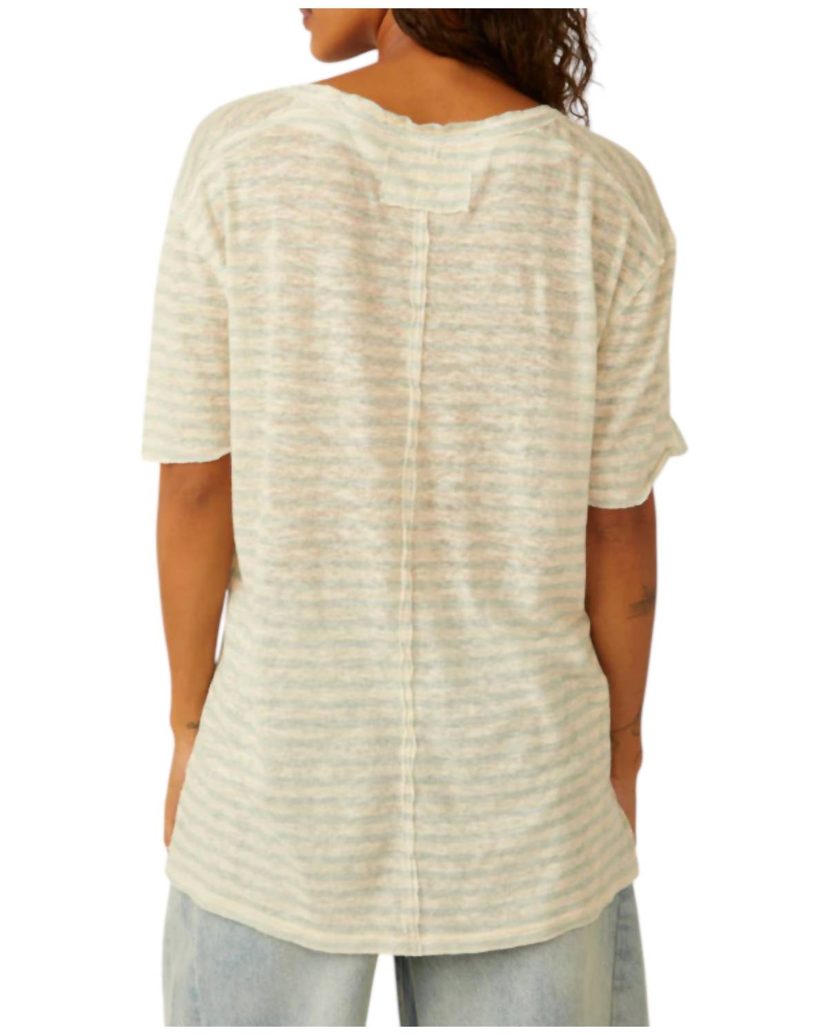 Esta camiseta clássica de manga curta será sua peça essencial nesta temporada e nas próximas. Apresentamos a camiseta Care FP All I Need da Free People, perfeita para a mulher antenada no estilo. Esta camiseta de manga curta com um marcante Mineral Sea Combo apresenta um design clássico de gola em V e uma estampa listrada. Confeccionada em uma mistura de linho macio, oferece um ajuste confortável. Fecho: Puxe para vestir. Cuidados: Lavar à máquina.