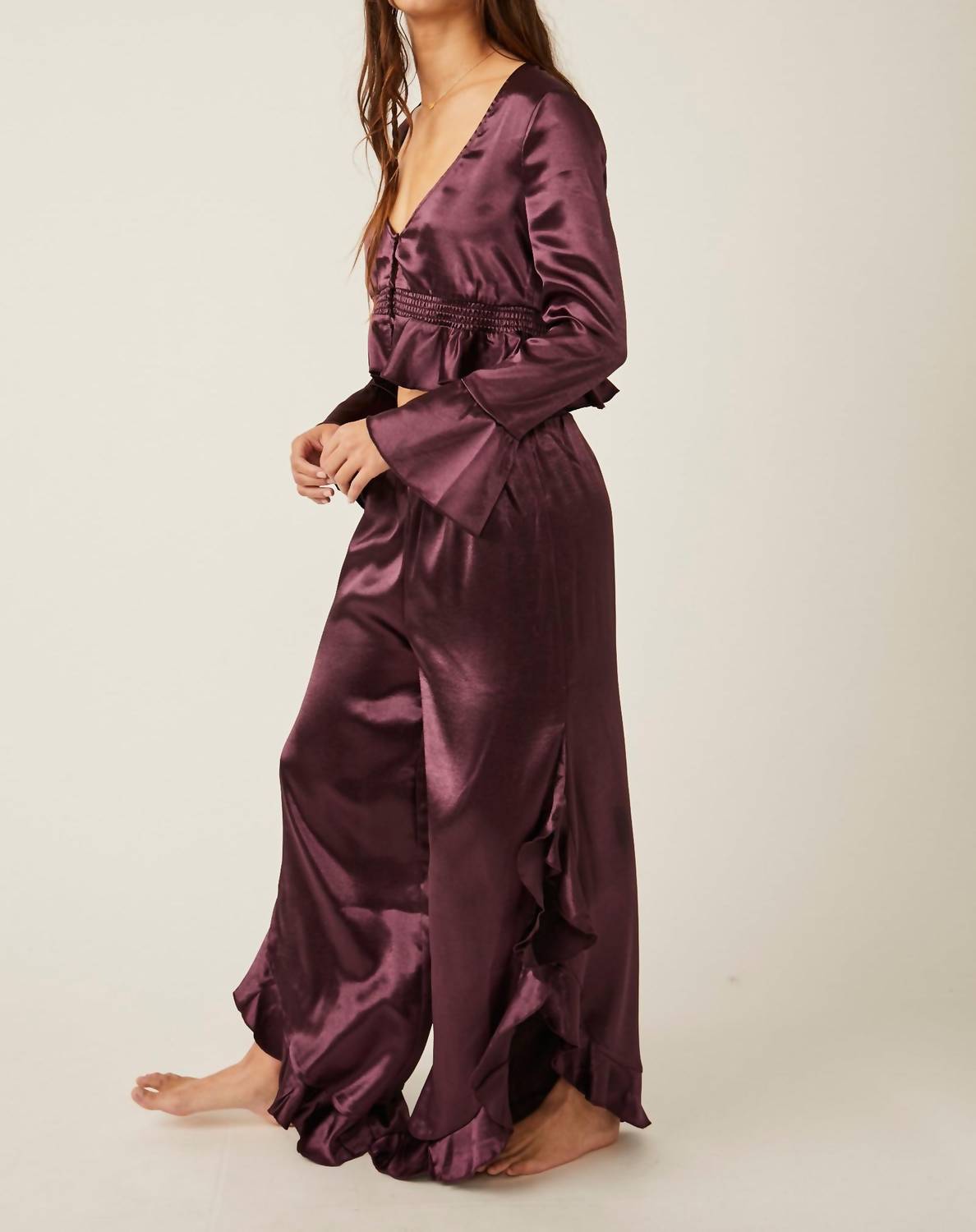 Pijama com top curto de manga comprida com detalhe franzido e calça pantalona combinando com fendas laterais. Blusa com decote em V e mangas compridas. 100% poliéster. Lavar à máquina e secar no varal. Importado. 100% poliéster.