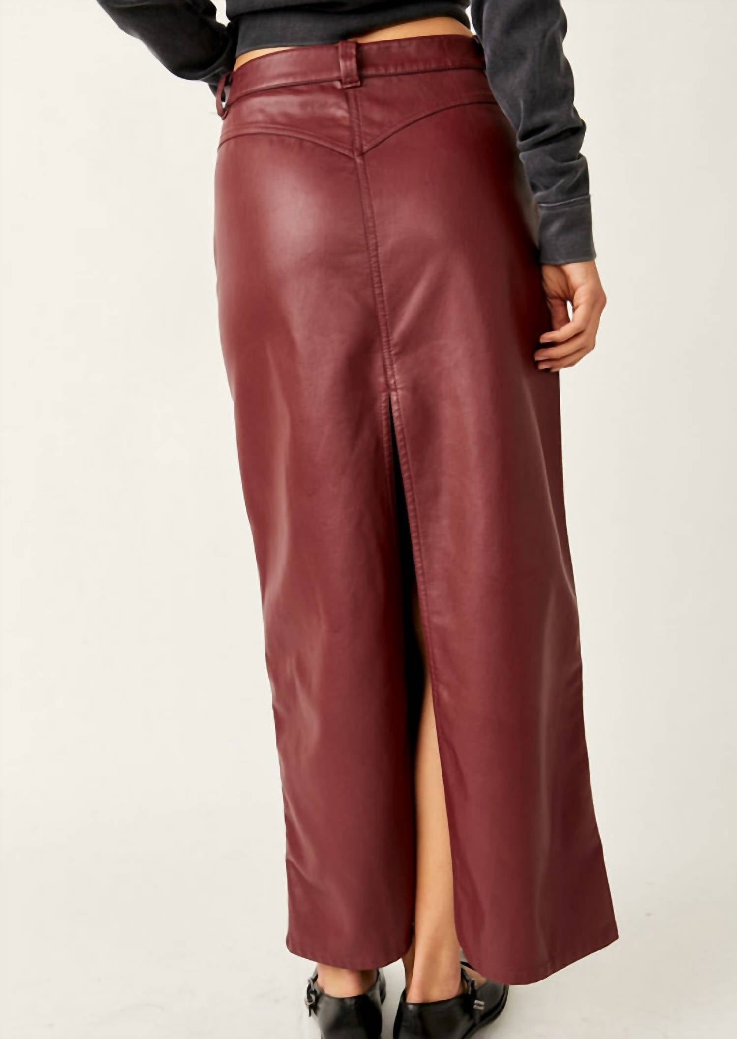 Vista sua camiseta favorita para um visual mais casual, porém feminino. Eleve seu estilo com a saia City Slicker da Free People, apresentada em um tom vinho intenso. Esta saia longa de couro vegano apresenta um corte justo com uma fenda charmosa, confeccionada em 100% viscose com acabamento em poliuretano revestido. O design inclui bolsos práticos e fecho por botão. Para cuidados, basta lavar à máquina com água fria em ciclo delicado.