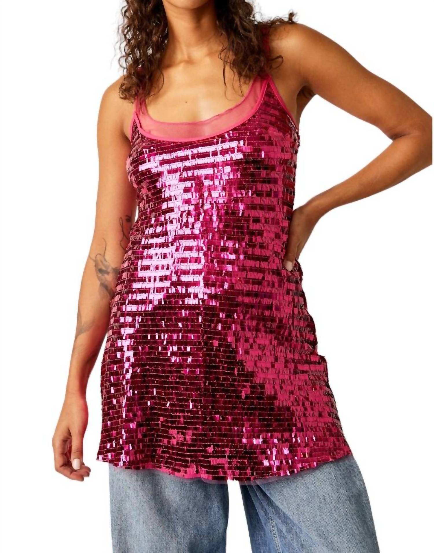 Os detalhes em lantejoulas por toda a peça captam a luz a cada movimento, enquanto o acabamento transparente adiciona um toque de charme delicado. O decote redondo e o design sem mangas, complementados por um ousado decote em V, oferecem um toque sedutor que certamente chamará a atenção. 100% poliéster.