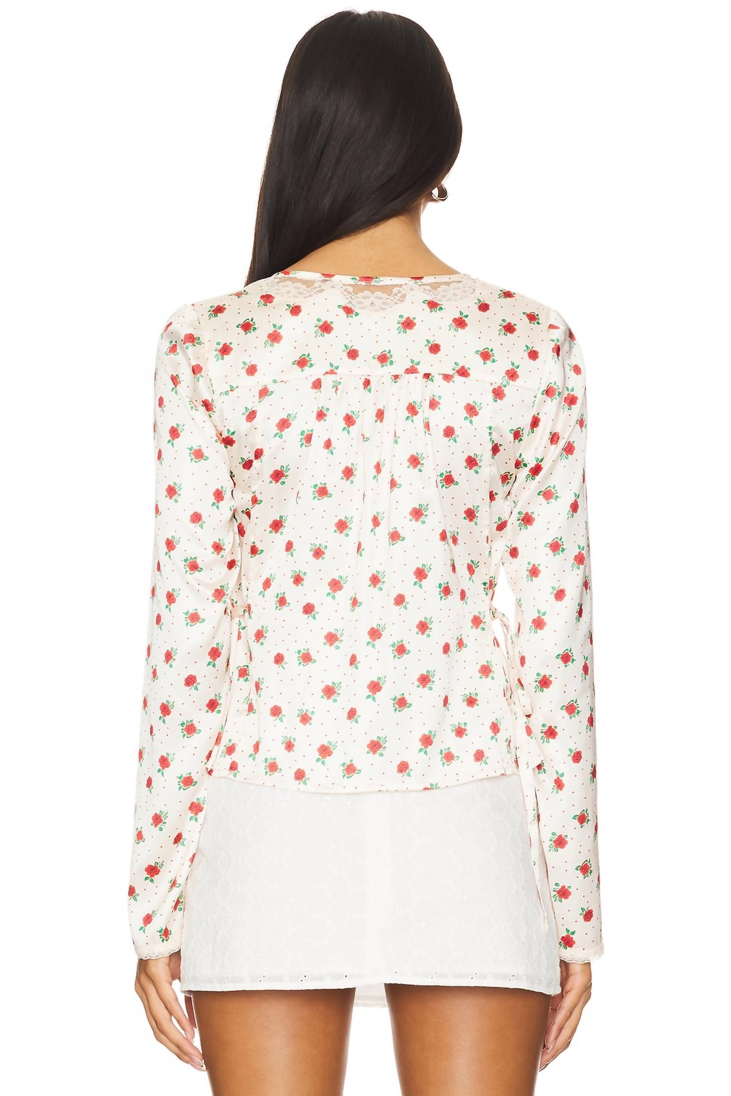 Estampa floral feminina e acabamento acetinado macio. Blusa de manga comprida com decote em V profundo e comprimento relaxado até o quadril. Fabricada na Índia. Possui amarração ajustável e fecho frontal por botões para um visual personalizável. Para melhor conservação, recomenda-se lavagem a seco.