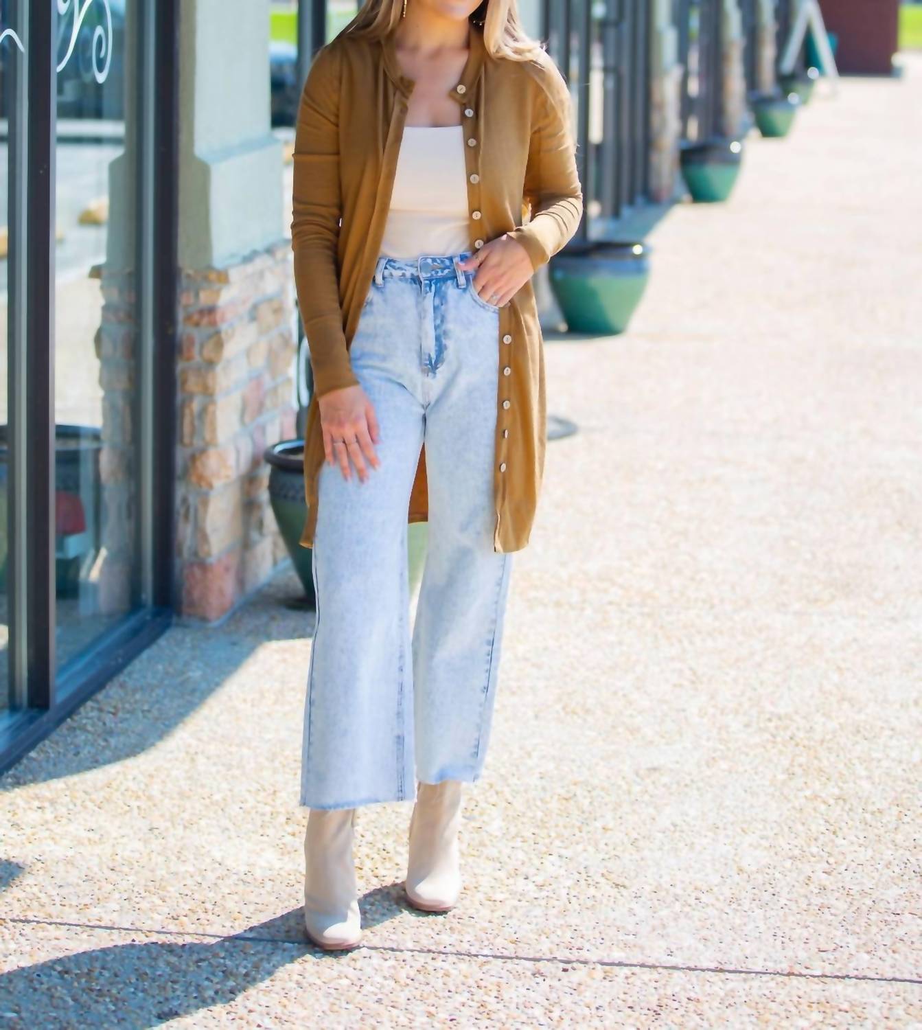Eleve seu guarda-roupa com o Gia Cardi da Free People, um cardigan longo na cor Warm Tobacco, projetado para uma silhueta elegante. Confeccionado com mangas longas em malha canelada básica, sua composição inclui 75% poliéster, 22% algodão e 3% elastano. Este cardigan feminino possui fecho de botão e gola redonda, com medidas para tamanho pequeno, incluindo comprimento de 89 cm e comprimento da manga de 68 cm. O cuidado é simples, com opções de lavagem à máquina com água fria e secagem em tambor.