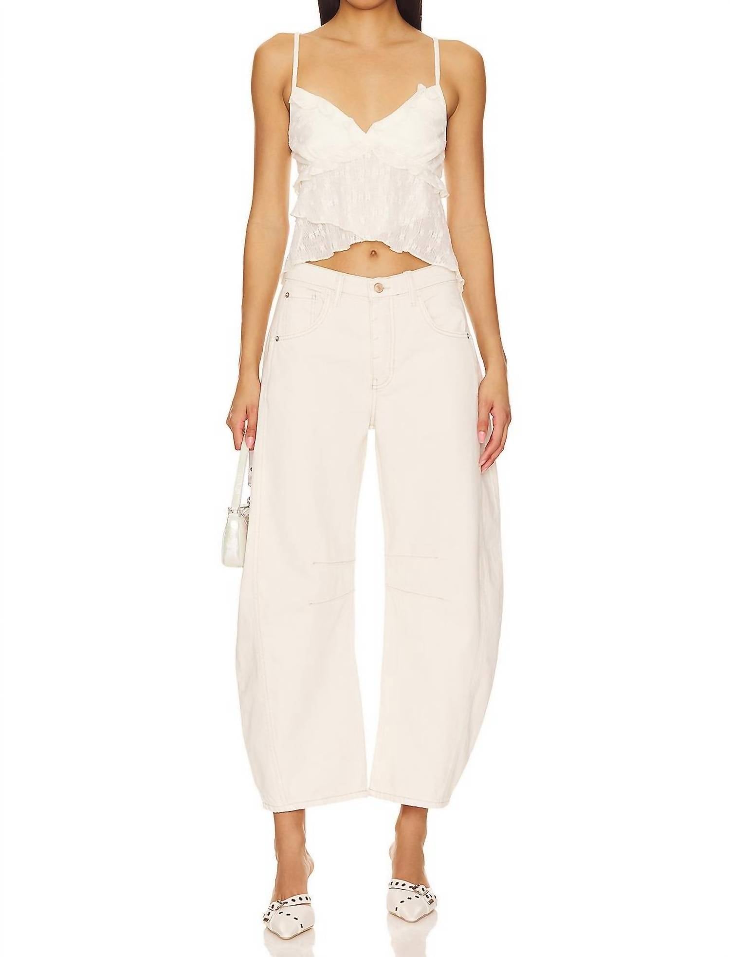 Modelagem cano médio. Fecho com botões. Modelagem com 5 bolsos. Pernas largas. Comprimento cropped. Largura de 61 cm nos joelhos, 25 cm na barra. Confeccionada em 100% algodão. Lavável à máquina.