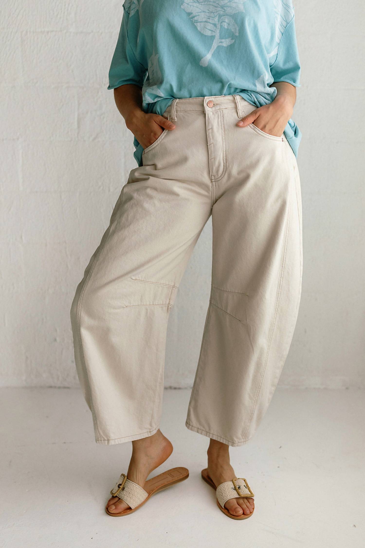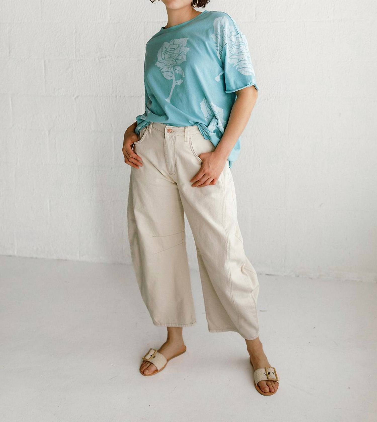 Apresenta corte médio com sutis detalhes desgastados e pernas largas que afunilam no tornozelo. Modelagem ligeiramente grande; recomenda-se um tamanho menor. 57% algodão, 43% liocel. (Medidas para o tamanho 28) Costura interna: 66 cm; Cintura: 82 cm; Quadril: 112 cm; Gancho: 30 cm.
