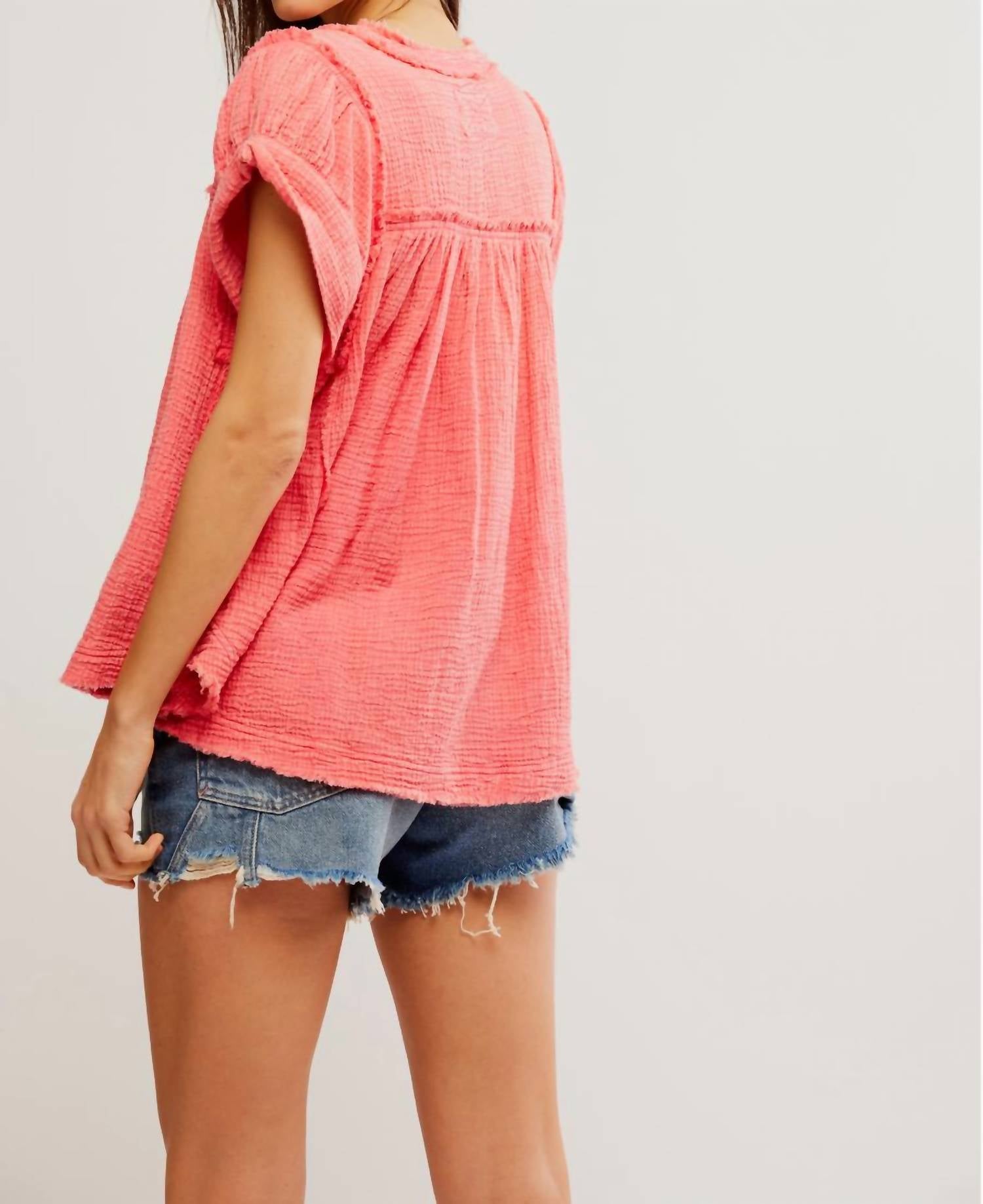 Blusa transparente com caimento amplo e rodado, com meia abertura abotoada e mangas curtas. Comprimento de 66 cm (tamanho médio). Gola redonda. Gola dividida. Mangas curtas. 100% algodão. Lavagem a seco ou à máquina, secagem no varal. Importado.