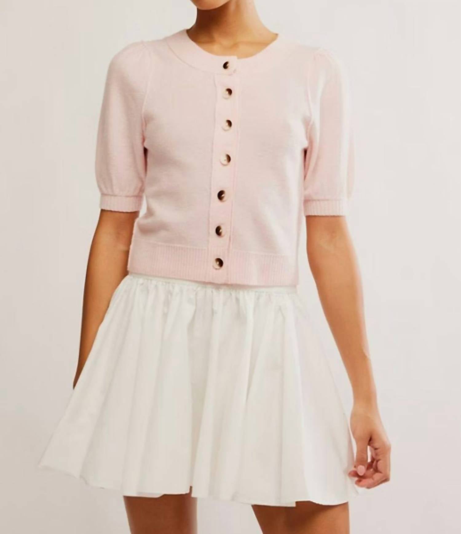 Doce e clássico, este cardigã de malha tem um estilo cropped com mangas curtas bufantes e botões contrastantes na frente.