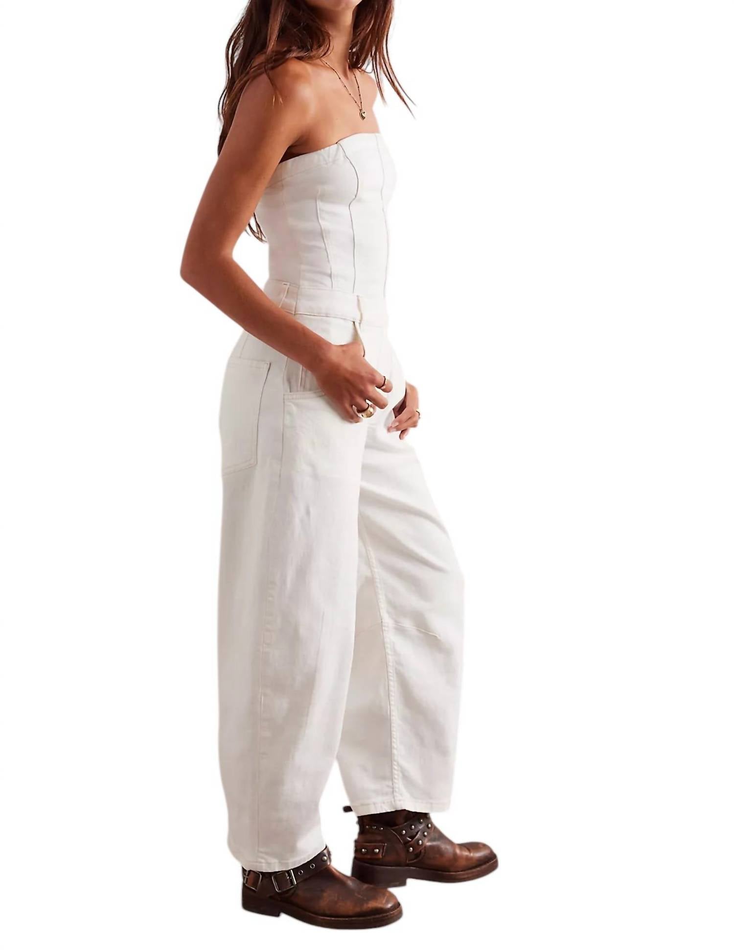 Este macacão Je Suis Pret Barrel Leg apresenta um corpete inspirado em espartilho com perna alta e relaxada e design prático de cinco bolsos, feito de 100% algodão com costura interna de 25,5" e 12,25" de altura.