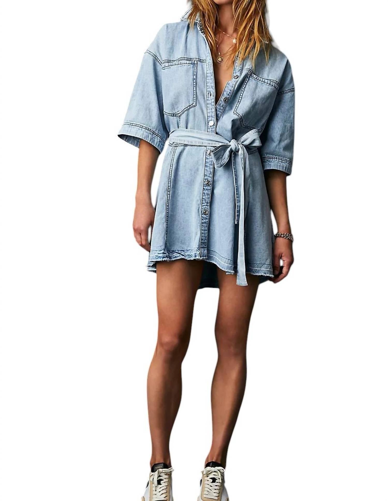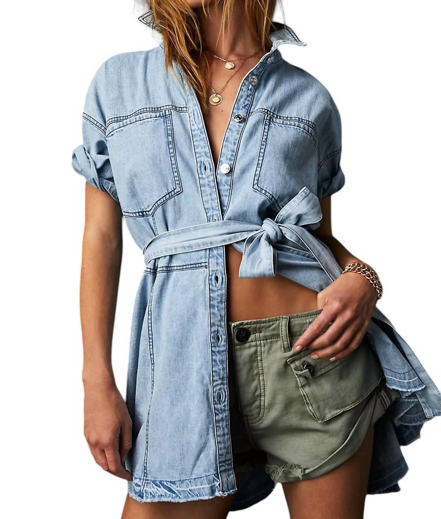 Apresentamos a Túnica Jeans Jenny da Free People, uma homenagem à moda vintage com um toque moderno. Esta túnica feminina apresenta uma silhueta de manga comprida em 100% algodão, caracterizada por um corte ligeiramente alongado e relaxado, com gola clássica. O fecho frontal por botões, o detalhe de amarração na cintura e os bolsos duplos aplicados no busto conferem versatilidade, enquanto o sutil efeito desgastado na bainha confere um toque de textura.