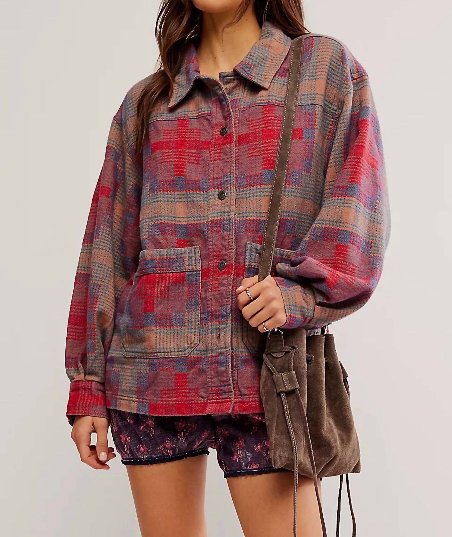 A camisa Keep It Cozy da Free People é uma versão única da flanela clássica, com um design em vermelho vibrante e estampado. Esta camisa apresenta um corte folgado e oversized, com mangas compridas e gola alta, confeccionada em flanela de algodão confortável. Inclui detalhes práticos de bolsos aplicados e um prático fecho frontal com botões, perfeito para usar em camadas em qualquer estação. O cuidado é simples, com instruções de lavagem à máquina, tornando-a uma escolha fácil para o seu guarda-roupa.