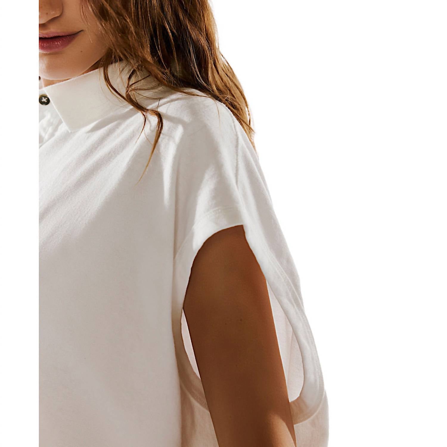A camiseta de manga curta que você vai querer em todas as cores. Apresentamos a Polo Keep On da Free People, uma peça atemporal em tom marfim clean que oferece estilo e conforto. Com mangas curtas e confeccionada em algodão liso, é perfeita para coquetéis ou ocasiões na primavera. O fecho é prático com botões, enquanto a gola adiciona um toque de charme clássico.