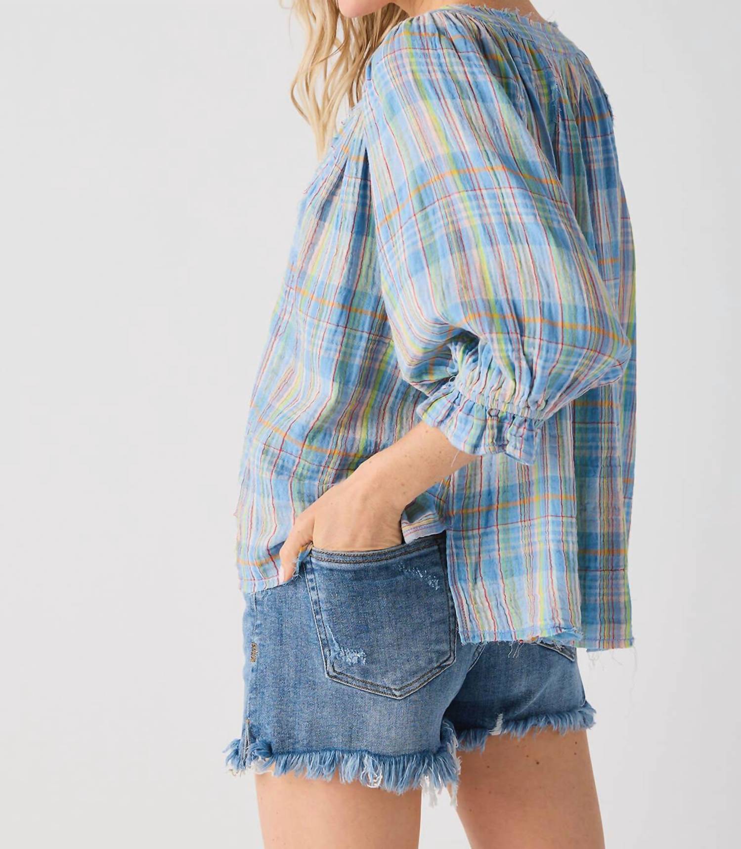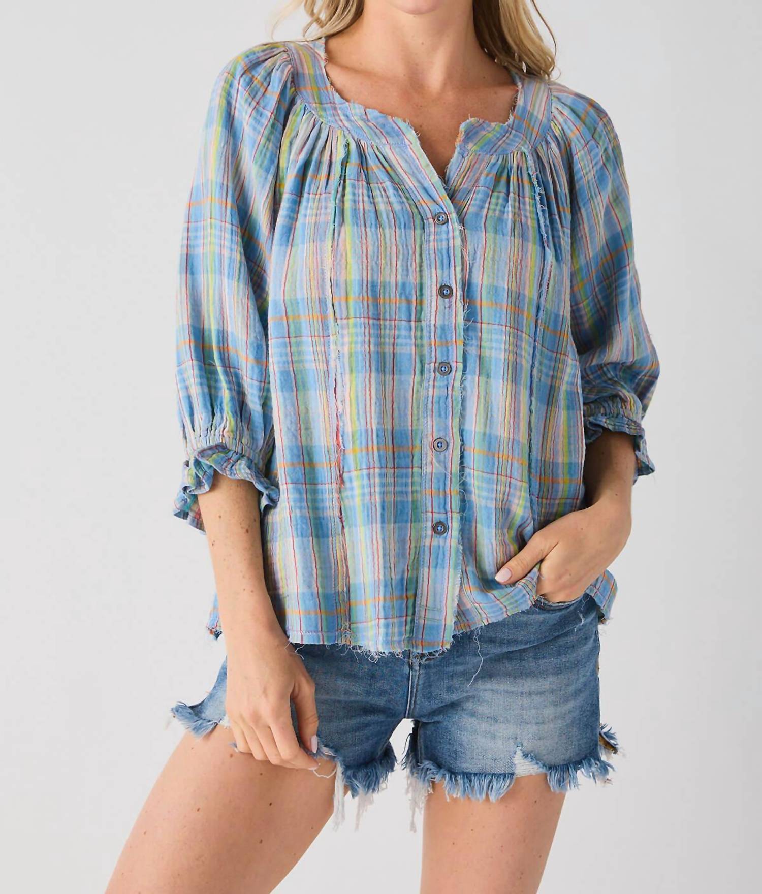 Blusa xadrez de gaze com alças largas. Possui decote redondo, botões frontais, mangas 3/4, costuras sem acabamento e silhueta ampla e relaxada. Caimento relaxado. Lavagem à máquina com água fria. A modelo tem 1,73 m e veste tamanho XS.