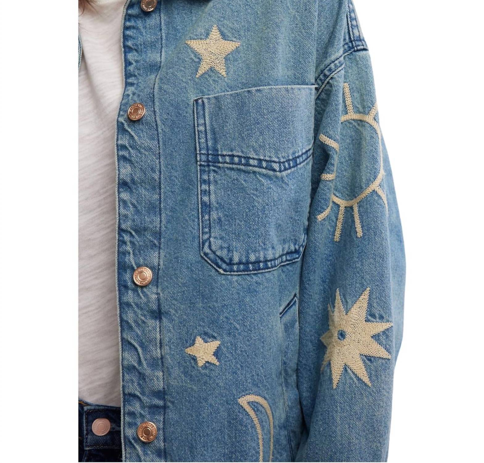 Gola alta, mangas compridas com punhos abotoados e fecho frontal com botões. Dois bolsos no peito. Estampa de estrela por toda a peça. 100% algodão. Lavagem à máquina com água fria. Importado.